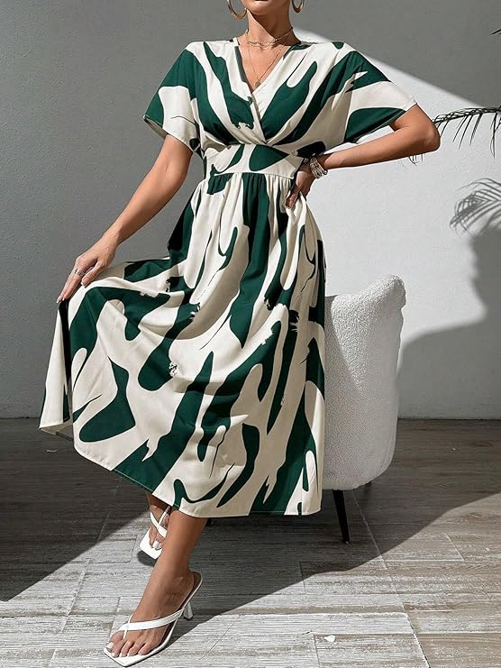 Embrace bold style with this vibrant Abstract Print Midi Dress. This piece features a striking design in deep emerald green and crisp off-white, with an artful, fluid pattern that ensures you stand out.