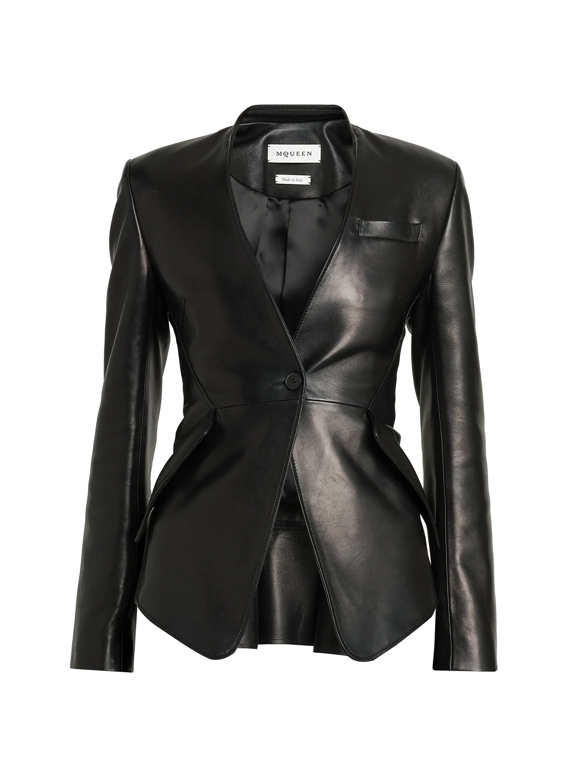 This sophisticated jacket, identified by the McQueen label, is a powerful statement piece crafted from supple black Nappa leather. It features razor-sharp tailoring with strong, defined shoulders and a sleek, collarless V-neckline that gives it a modern, minimalist edge. The fit is highly structured, cinching dramatically at the waist before flaring out into a subtle, architecturally-inspired peplum hemline, a signature McQueen element. The closure is minimal, featuring a single button at the waist. Details include a small, angled breast pocket and refined seam work that highlights the sculpted silhouette. This jacket is the perfect piece for adding a sharp, luxurious texture and an avant-garde touch to evening wear or a high-fashion day look.