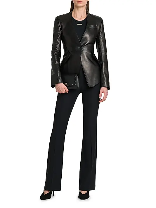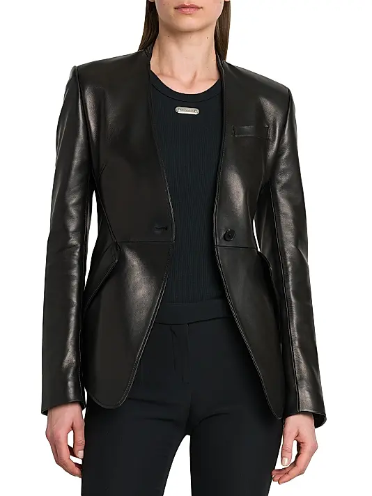 & Free ShippingA luxurious black leather jacket with a structured, single-button closure, a deep V-neckline, and a sculpted waist that flares into a subtle peplum hem.