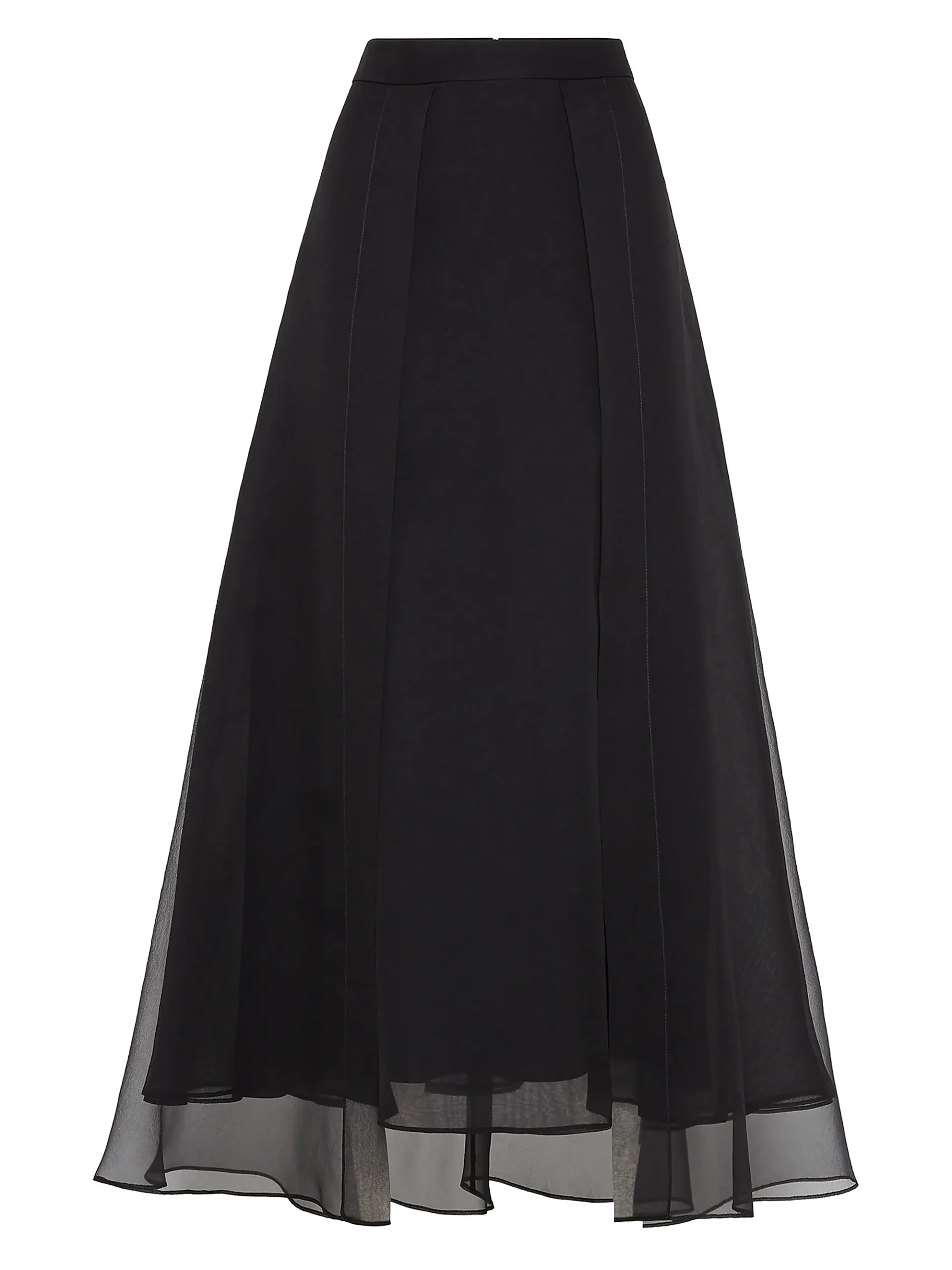 This elegant black maxi skirt is a versatile piece perfect for both formal and evening wear. It features a clean, high-waisted design with a structured waistband that offers a flattering foundation. The silhouette is a gentle A-line, flowing gracefully to a floor or ankle length. The skirt is constructed with an opaque base layer and finished with a voluminous, sheer black chiffon or georgette overlay. This layering adds beautiful movement and a subtle transparency to the hemline, enhancing its luxurious drape. It’s an essential piece for pairing with detailed tops, cropped jackets, or structured blouses for a timeless, sophisticated look.