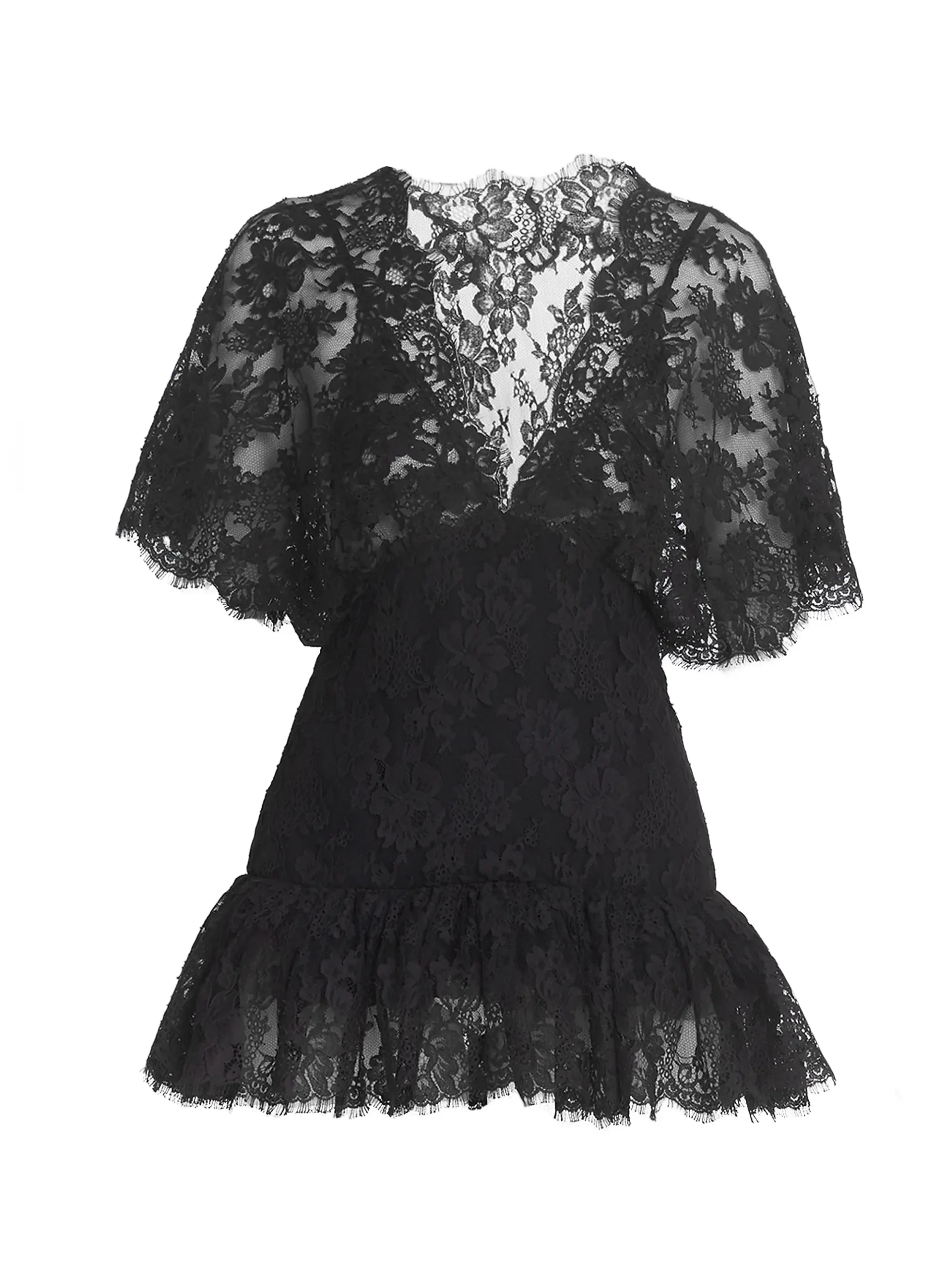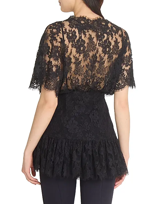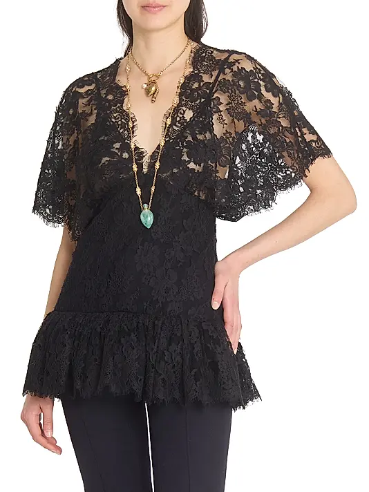 • Details: Sheer lace yoke, fitted corset-style waist, flutter sleeves, scalloped trim.