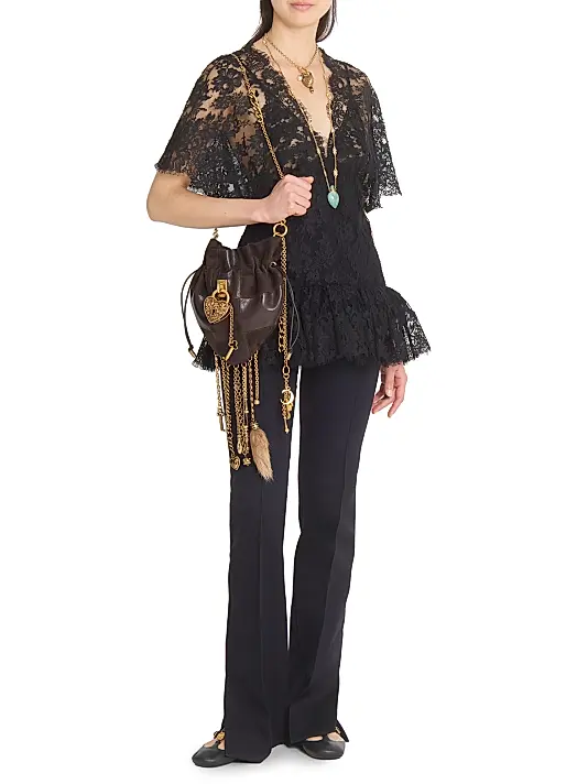 Exude dramatic romance with this intricately designed black lace top. The piece features a sheer, delicate high mock-neck with fine scalloped trim and dramatic chiffon or lace flutter sleeves with a wide bell-like shape. The bodice is highly structured, made from a denser, opaque lace or woven fabric, designed to mimic a corset and beautifully cinch the waist for a defined hourglass silhouette. The sheer upper yoke reveals a sweetheart-lined bust underneath. This top is perfect for elevated evening wear, adding gothic glamour to high-waisted bottoms.
