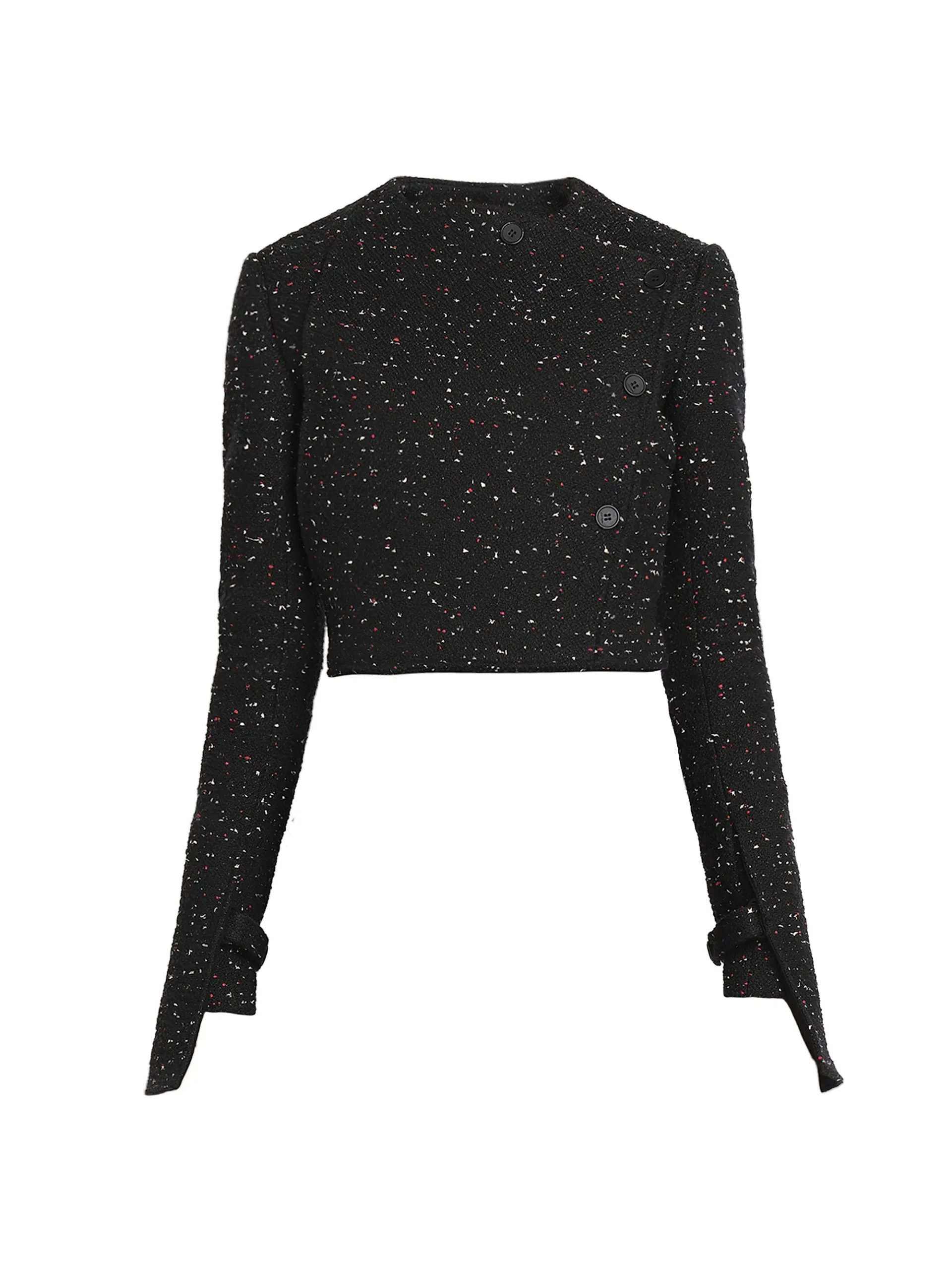 This elegant cropped jacket is a sophisticated piece crafted from a textured black tweed or bouclé fabric, subtly infused with multi-colored specks of thread, notably white and red, which add depth and visual interest. It features a modern, collarless, and rounded neckline. The silhouette is boxy and ultra-cropped, designed to sit high on the waist, making it perfect for pairing with high-waisted bottoms like the skirt uploaded. The jacket is finished with distinctive black buttons—some on the front closure and a subtle detail on the cuffs of the long, fitted sleeves. This chic bolero style is a versatile layering piece that instantly adds structure and high-end texture to an evening or smart-casual ensemble.