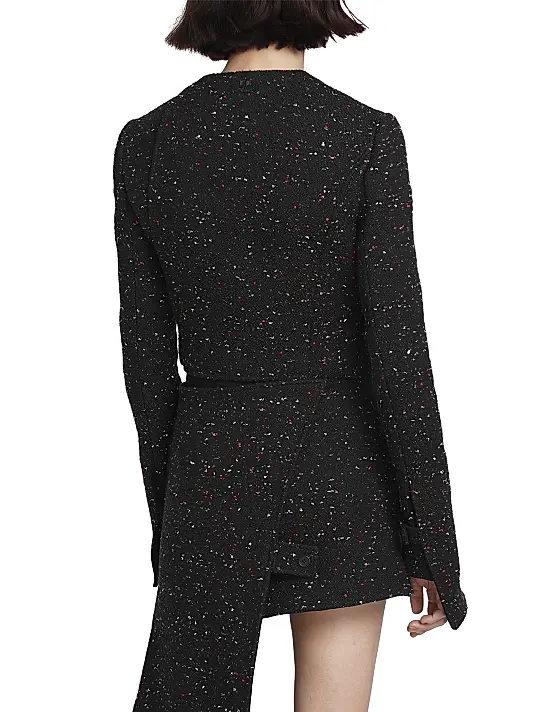 & Free ShippingA luxurious, cropped black tweed jacket featuring a collarless neckline, long fitted sleeves, and colorful speckle details throughout the textured fabric.