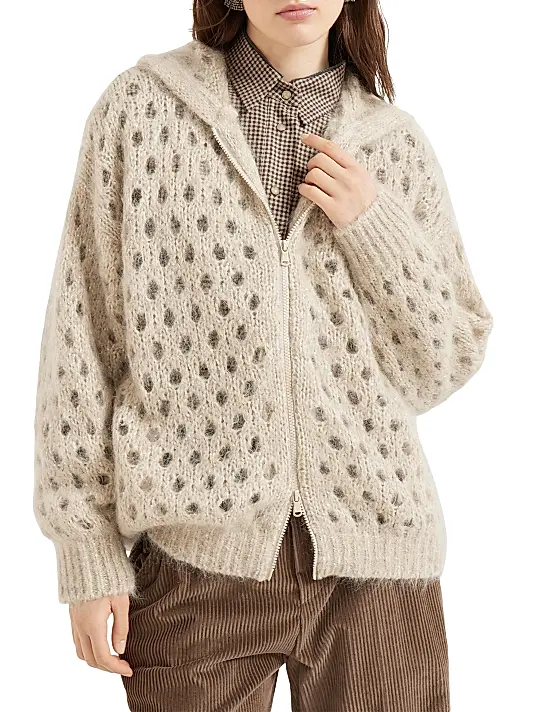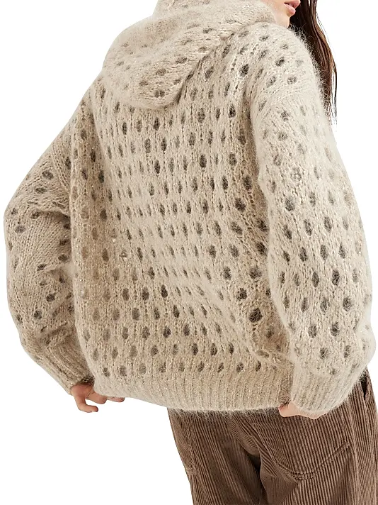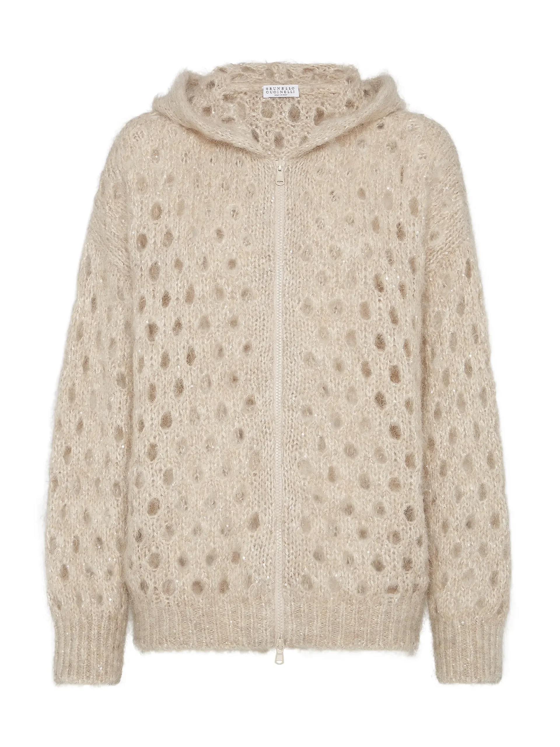 This Brunello Cucinelli piece is the epitome of luxurious, casual layering. The fine gauge, openwork construction ensures it remains lightweight, making it an ideal transitional piece for cooler evenings or air-conditioned settings. The mohair and silk blend provides exceptional softness and an elegant, subtle shimmer that catches the light. Finished with ribbed cuffs, a ribbed hem, and a smooth front zipper, this hoodie effortlessly combines comfort with the brand’s signature refined aesthetic. Pair it over a simple camisole, a crisp white shirt, or as a cozy yet elegant layer over a dress.