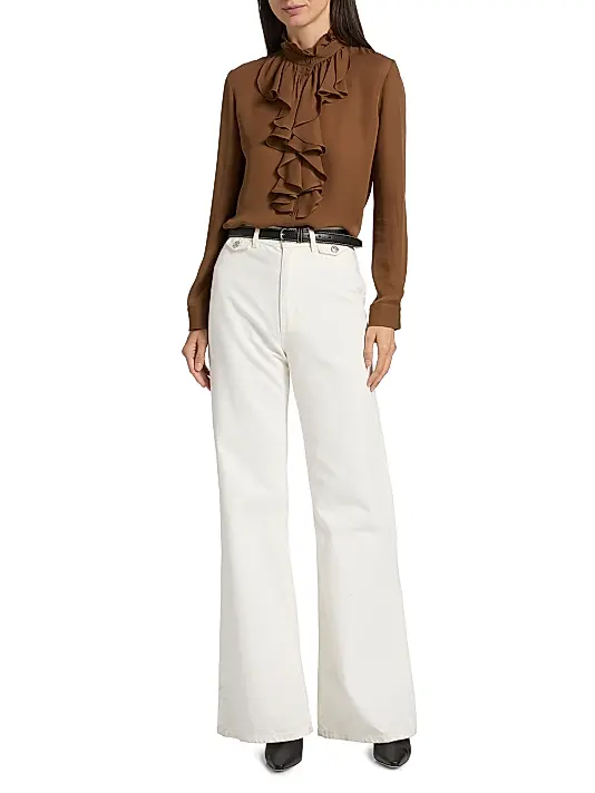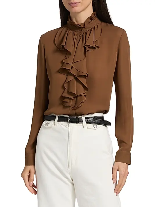 The defining feature is the cascading ruffle detail that runs vertically down the centre of the shirt, gracefully framing the button placket. The neckline is finished with a delicate ruffled stand collar, adding to the sophisticated look. The sleeves are tailored, ending in simple buttoned cuffs. With its soft drape and dramatic front detail, this blouse is perfect for adding texture and flair to formal attire or dressing up casual pieces.