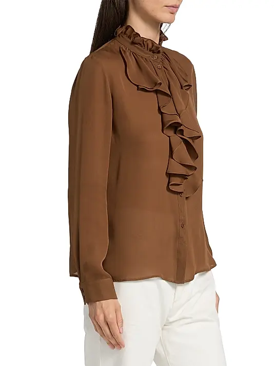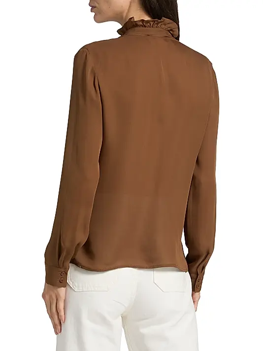 This elegant long-sleeve blouse offers a romantic, vintage-inspired aesthetic. It’s crafted from a fluid, lightweight fabric, likely silk or a silk blend, in a rich, warm caramel or deep brown hue.