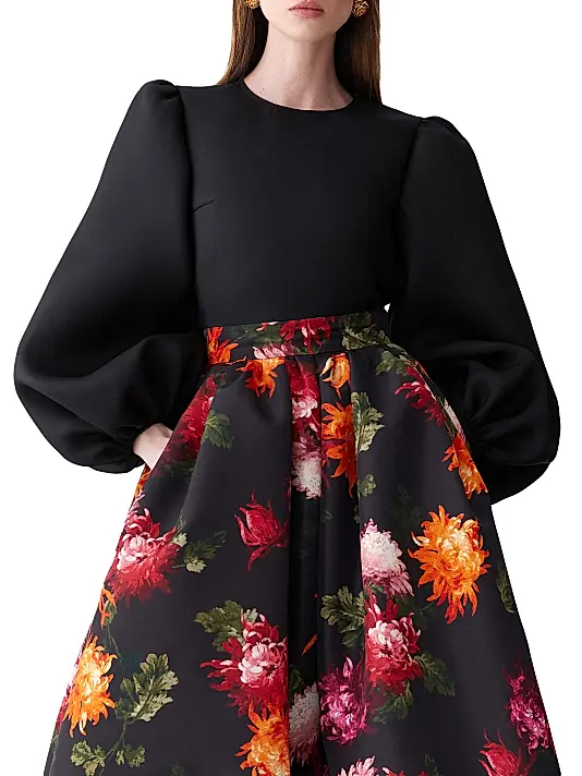 From the Chalet Collection. Crafted of luxurious silk gazar, this Carolina Herrera blouse is elevated by billowing sleeves and puffed shoulders meticulously sculpted for a voluminous effect. Round neck, long puff sleeves with elasticized cuffs, back button closure. 100% silk. Dry clean only. Made in USA. Model measurements: 5’10” tall, wearing US size 4.