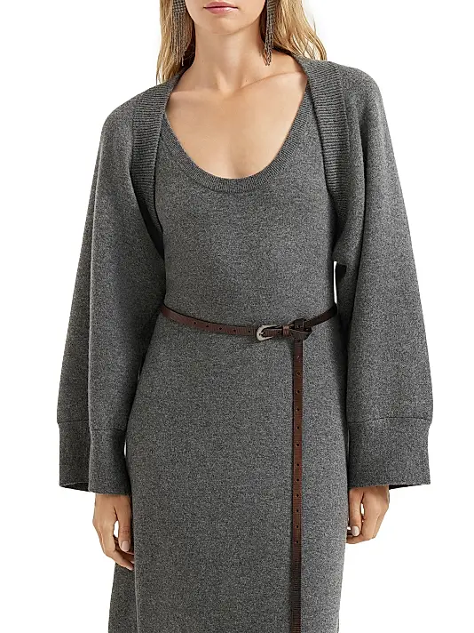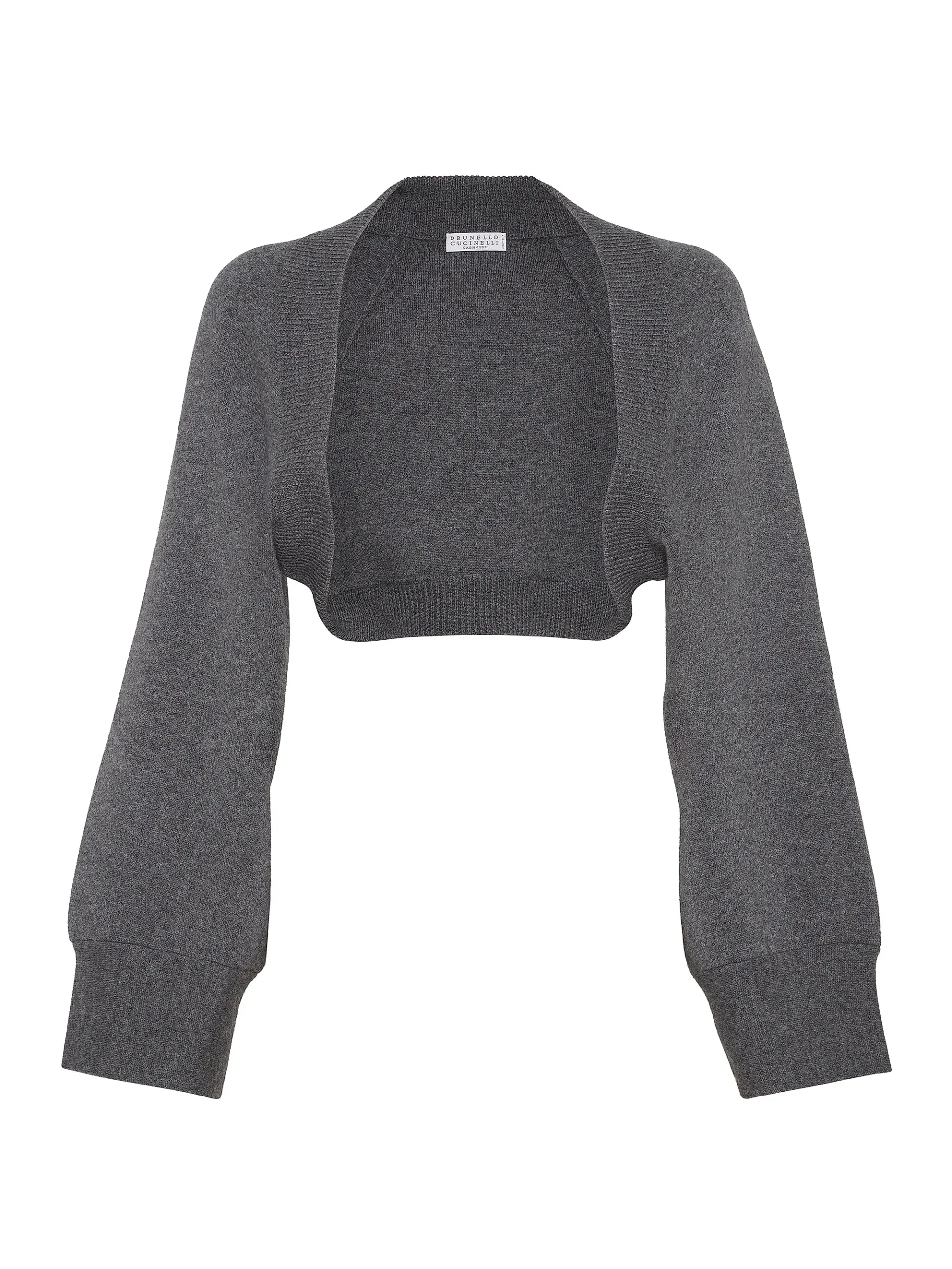 An elegant and minimalist layering piece, this bolero is crafted from a luxurious, soft dark grey knit . The design is an open shrug style, covering the shoulders and arms while leaving the midriff exposed. It features a wide, rounded neckline that sits neatly, and dramatically voluminous balloon sleeves that gather into long, fitted ribbed cuffs. This timeless piece offers warmth without bulk and is perfect for pairing with strappy dresses, sleeveless tops, or formal wear.