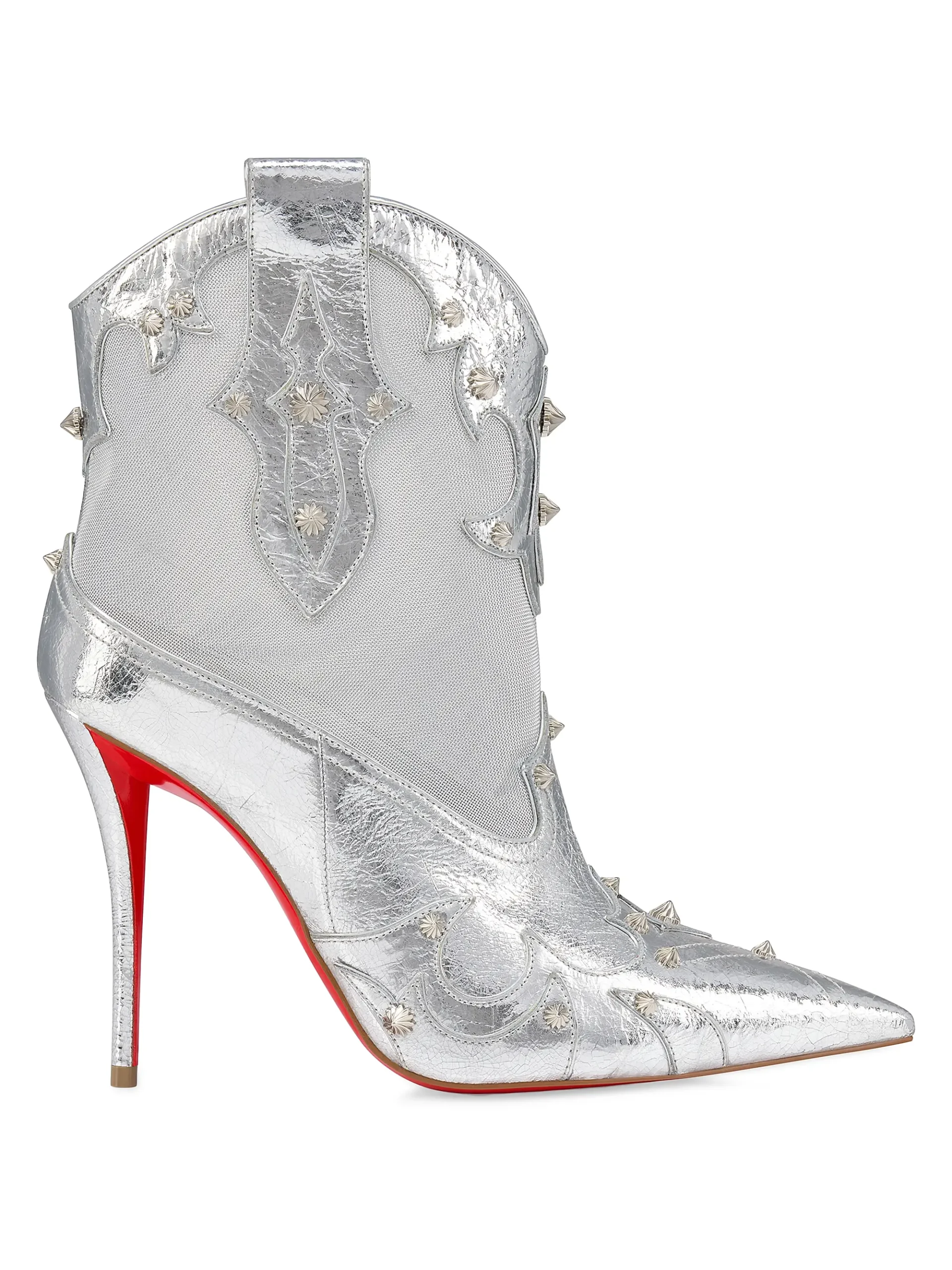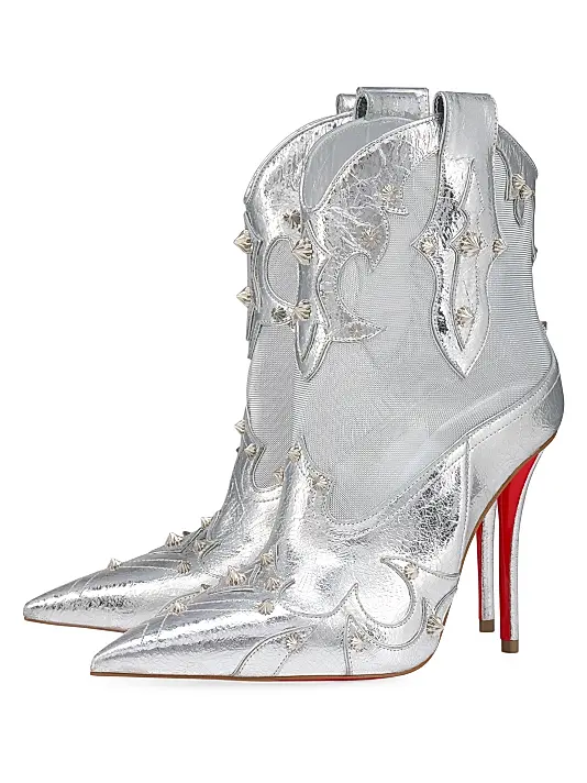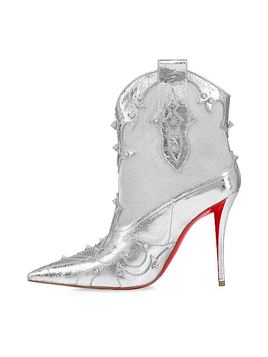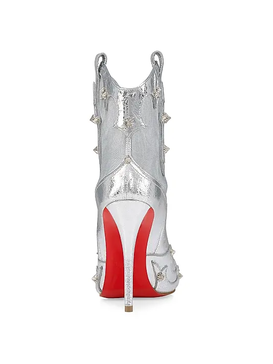 The Christian Louboutin Bootytiag Booties feature a striking laminated calf leather construction combined with fine mesh for a futuristic, sculpted look. Designed with a sleek silhouette and a 100 mm (3.9″) heel, these booties bring together luxury, shine, and the iconic Louboutin red sole. Expertly crafted in Italy to deliver elegance and confidence with every step.