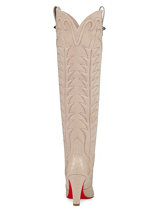 The Santia Botta boots by Christian Louboutin feature luxurious alligator-embossed calf leather combined with velvet calf for a rich texture. Designed with an elegant 85 mm (3.3″) heel, these Italian-crafted boots embody the brand’s signature sophistication. Known for its iconic red soles, Louboutin continues to deliver confidence-boosting, high-fashion footwear.