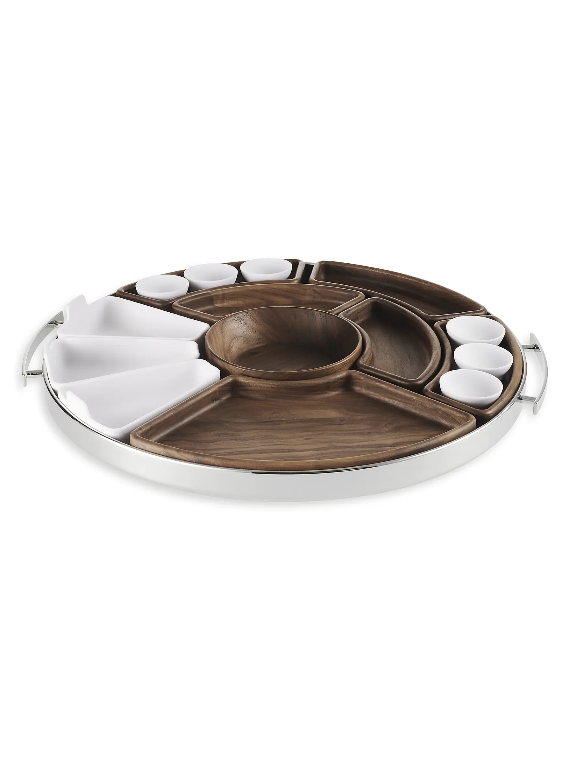 From the Mood Asia Collection. Includes one large wooden board, five rounded wooden boards, three large porcelain compartments, and six porcelain sauce bowls. Designed to serve sushi, maki, tempura, dim sum, and other Asian delicacies. Made of stainless steel, porcelain, and food-varnished wood. Hand wash. Made in France. Diameter: approx. 19″.