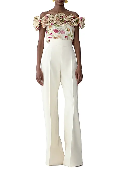 This show-stopping top is a beautiful blend of romance and high-fashion drama. Crafted from a structured, yet light fabric, the base is a creamy off-white adorned with a delicate, painterly floral print featuring poppies and foliage in shades of soft pink, vibrant coral, and pale green. The silhouette is boxy and cropped through the body, designed to contrast with the extraordinary volume at the neckline. The defining feature is the off-the-shoulder design, framed by voluminous, 3D ruffles that are sculpted to resemble large, intricate flowers. This top is a perfect centrepiece for garden parties, high-end dinners, or fashion events, designed to be paired with sleek, structured separates like the grey draped skirt you provided.