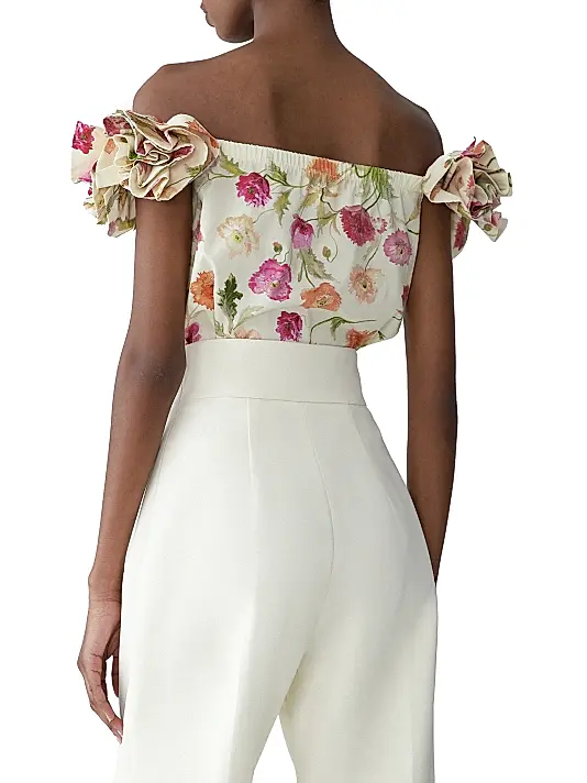 & Free ShippingA romantic off-shoulder top in a cream base with a vibrant pink and orange poppy print, defined by dramatic, oversized, sculpted floral ruffles at the neckline/sleeves.