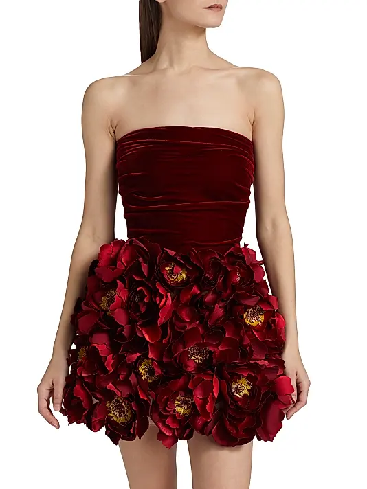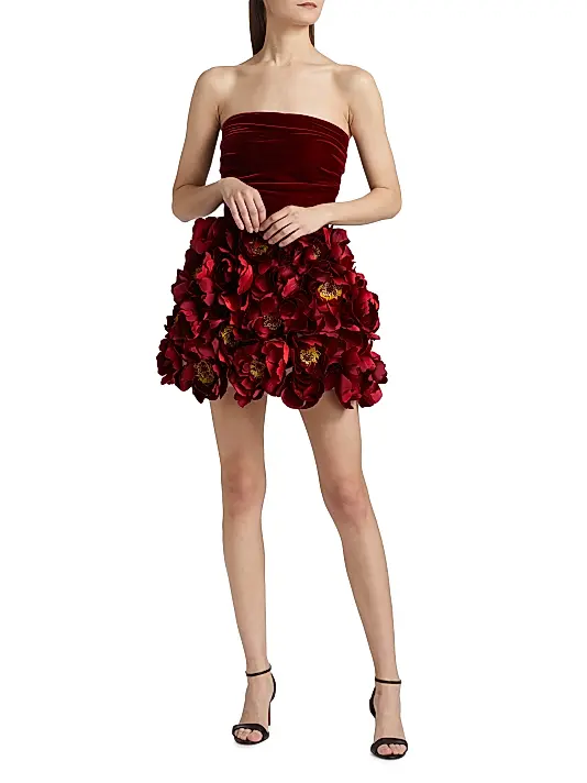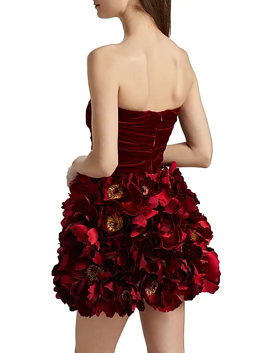 Crimson Velvet Strapless Mini Dress with 3D Floral Embellishment
