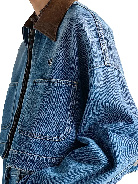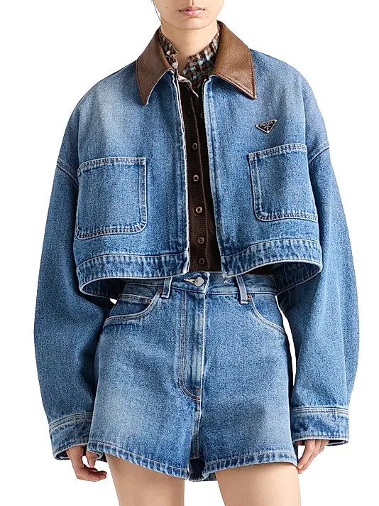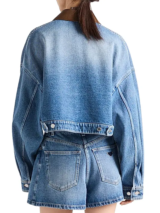 Inject a touch of rugged luxury into your wardrobe with this expertly crafted denim jacket. The piece features a relaxed, slightly oversized fit and a modern cropped silhouette. It is made from a mid-wash blue denim with subtle fading for a vintage, distressed look. The defining feature is the sharp contrast collar in rich, supple brown leather, which elevates the classic workwear design. The jacket is finished with a central zip closure, two large, square patch pockets on the chest/waist, and the signature designer logo plaque above the left pocket. This jacket is perfect for adding a cool, contemporary edge to any outfit.