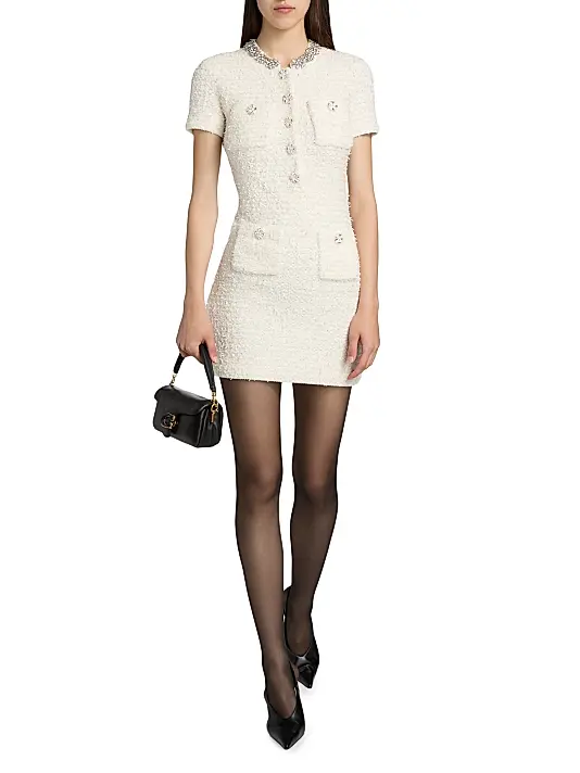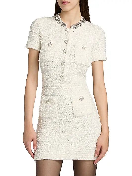 An elegant tweed/boucle mini dress featuring a knit collar lavishly embellished with crystals. Complete with a fitted silhouette and sparkling jewel buttons on the front and pockets.