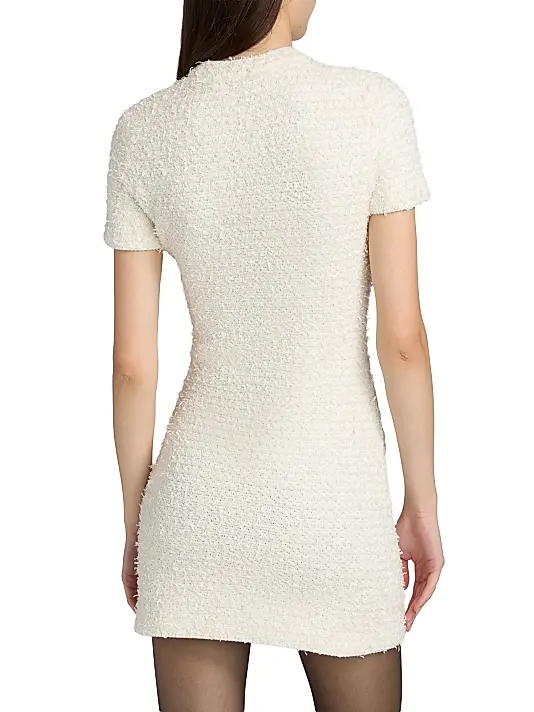 Embrace vintage glamour with a modern twist in this stunning tweed mini dress. Perfect for cocktail parties, luncheons, or elevated daytime events, this dress is crafted from a richly textured ivory/cream boucle or tweed knit that maintains a flattering, structured shape.