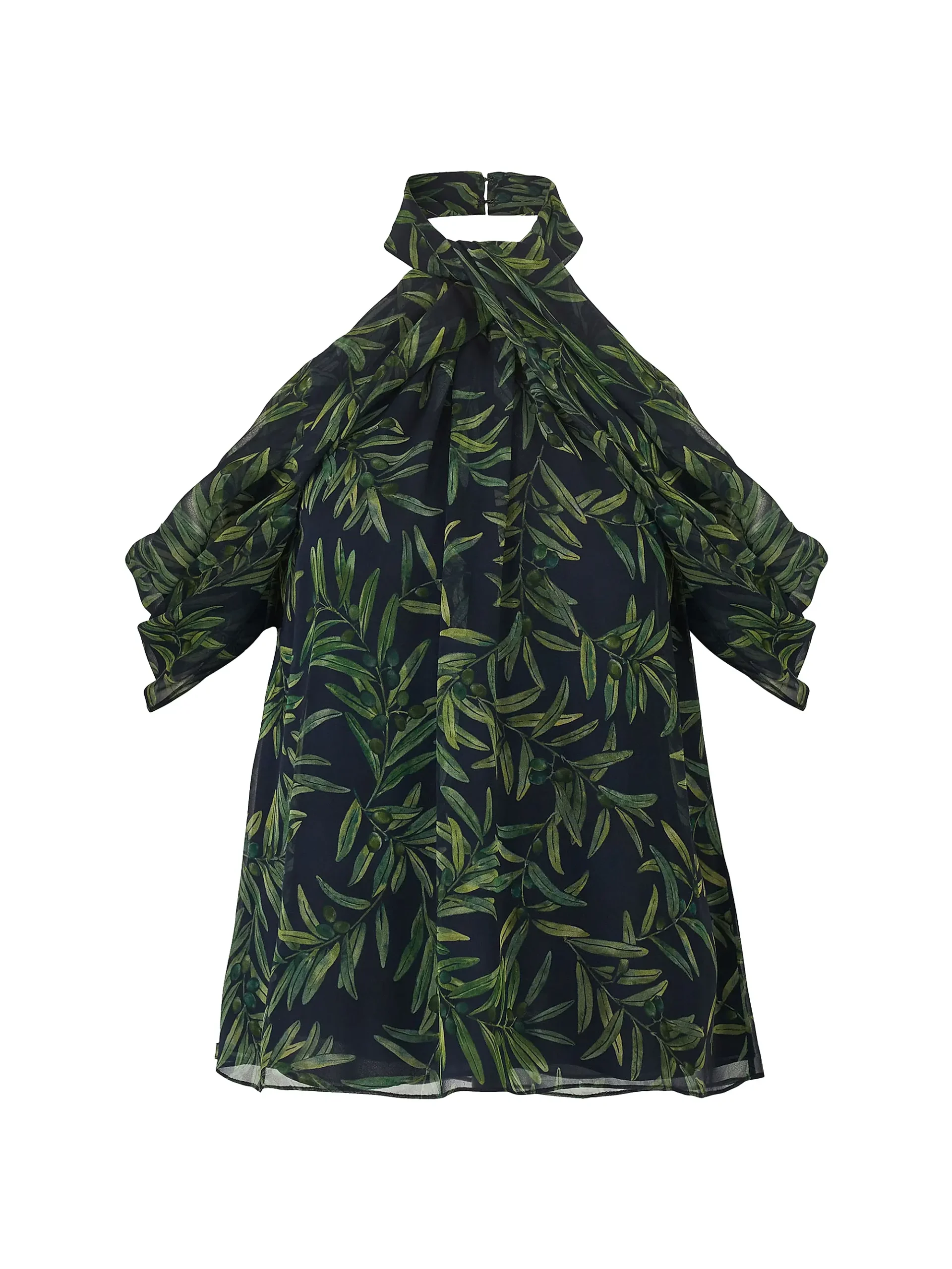 This elegant and airy top is designed for a dramatic, yet flattering fit. Crafted from a sheer, flowing fabric  on a deep black or navy base, it is brought to life by an all-over, painterly print of rich green tropical or olive leaves. The top features a sophisticated, structured high halter neck that beautifully frames the shoulders and collarbone. The silhouette is loose and voluminous through the body, providing comfort and movement. The short sleeves are styled as ‘cold shoulder’ or open sleeves with subtle ruffling, adding to its romantic, resort-wear appeal. This statement blouse pairs perfectly with tailored bottoms or, as seen in your full collection, a sleek pencil skirt for a refined, evening-ready look.