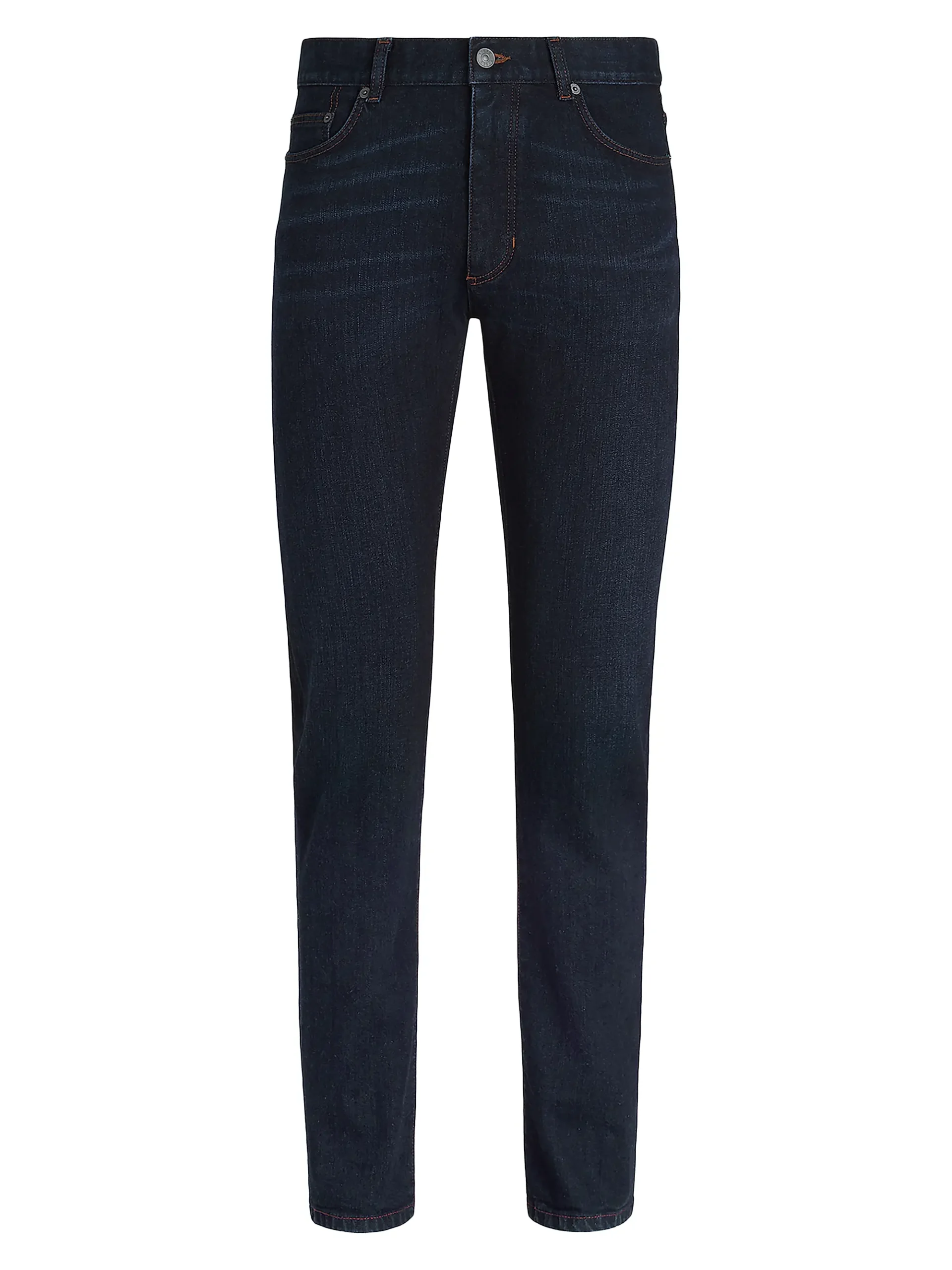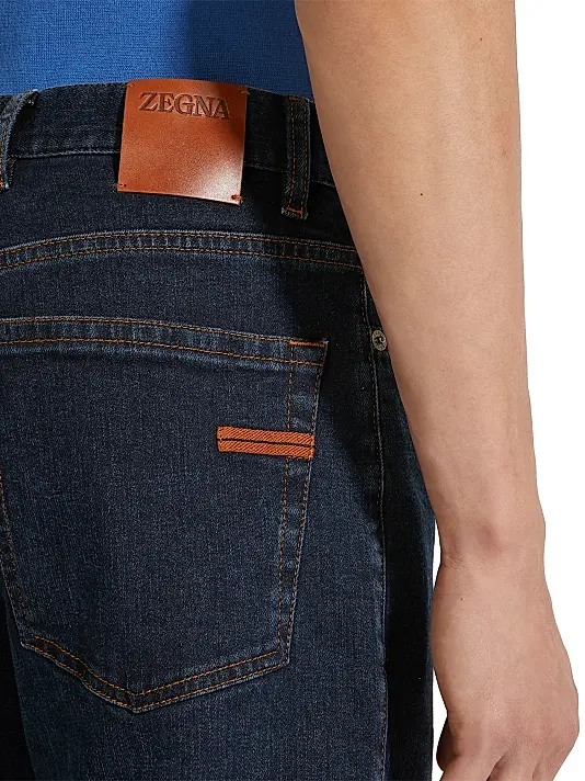 Crafted from premium dark indigo denim with minimal fading, these jeans retain a versatile, deep blue color that can easily be dressed up or down. A key detail is the subtle contrast stitching (appears orange or copper in color) throughout, which adds a classic, tailored accent against the dark fabric.