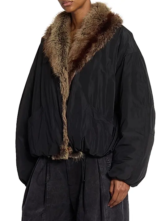 The jacket is crafted from a smooth, water-resistant technical nylon in classic black, offering a contemporary, voluminous silhouette. The standout feature is the opulent, removable (or fixed) brown faux fur collar and front trim. This rich texture adds immediate warmth and a touch of effortless luxury to the sporty bomber shape.