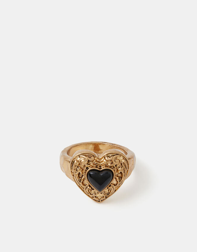 Make a bold, romantic statement with this striking Gothic Heart Ring. This piece features a large central heart-shaped setting with intricate filigree and ornate scrollwork surrounding a glossy black cabochon stone.