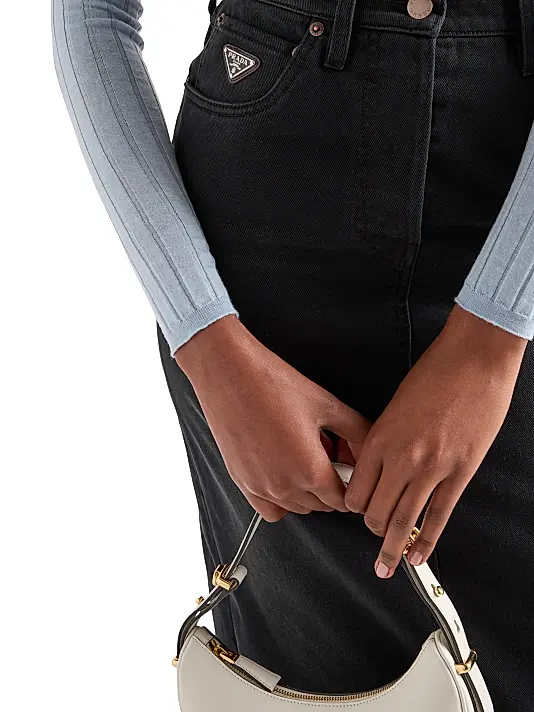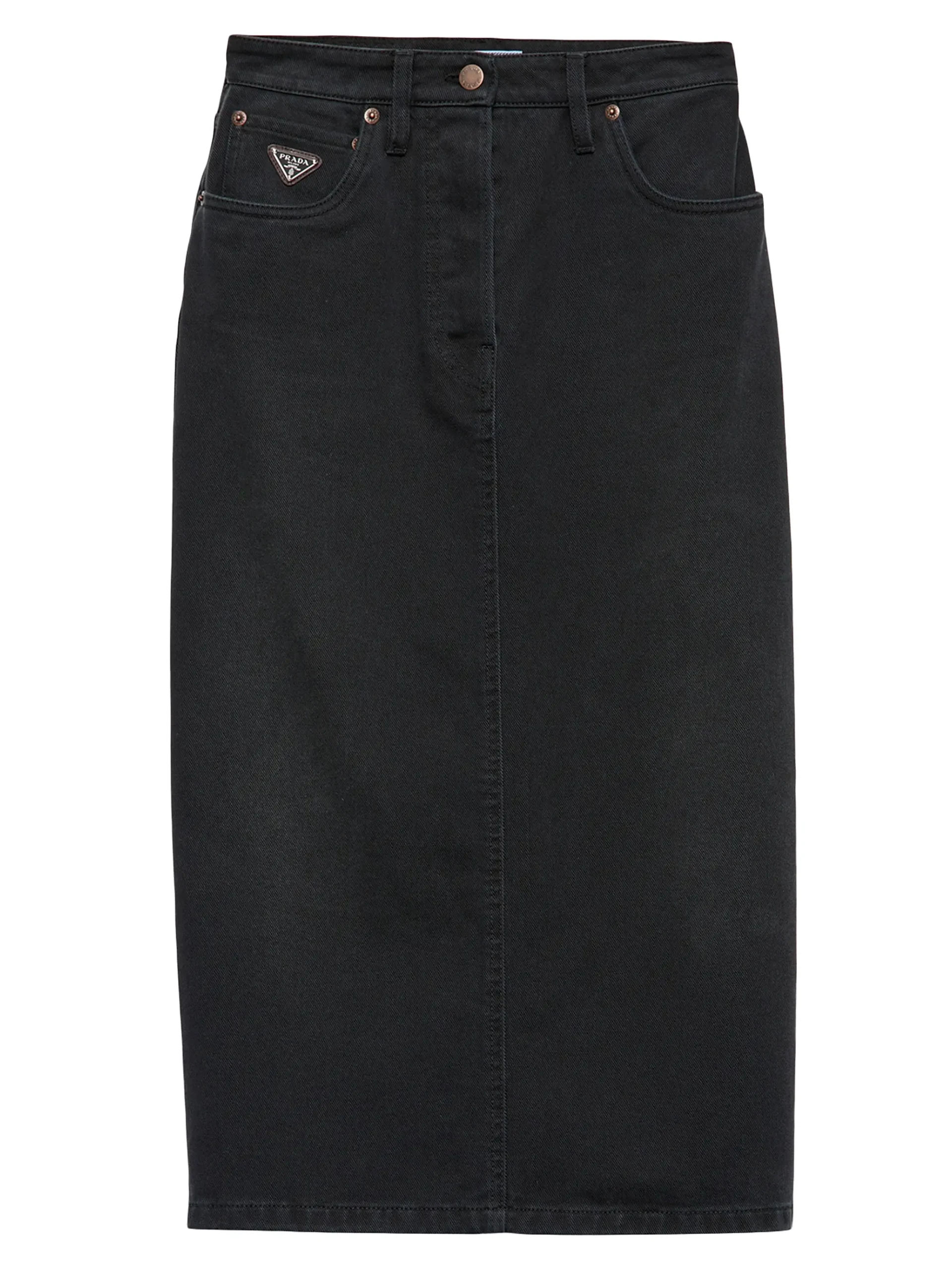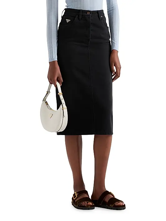 A wardrobe essential elevated with designer detailing. This skirt is crafted from a durable black washed denim, giving it a modern, slightly faded finish. The silhouette is a sleek high-waist midi fit, which falls to the knee or mid-calf and offers a flattering, elongated look. Classic five-pocket styling is subtly integrated, and the piece is finished with a button and zip fly. The signature element is the subtle, but recognizable, designer logo plaque located near the left front pocket. Pair it with a delicate blouse or an oversized knit for a versatile, stylish look.