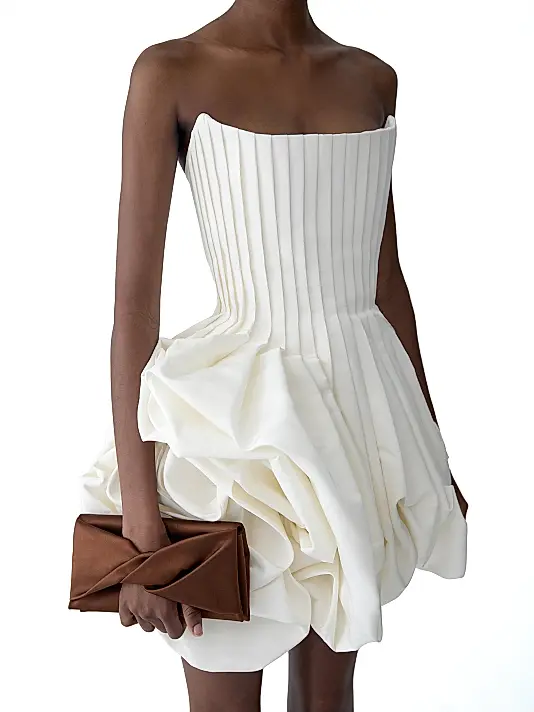 This avant-garde mini dress is a true statement piece, showcasing masterful tailoring and architectural design. The bodice is structured and fitted, featuring crisp, vertical micro-pleating that offers a refined texture and shape. The strapless neckline is sharp and clean. Below the waist, the dress transitions into a voluminous, asymmetrical skirt that is both fun and dramatic. This skirt is created by large, artfully draped and ruched fabric folds, giving it a textural bubble or floral-inspired silhouette. The ivory or pale cream color enhances its sculptural qualities, making it ideal for a high-fashion party, a bridal event, or a cocktail reception. It’s a dress designed to be the undisputed focal point of any look.