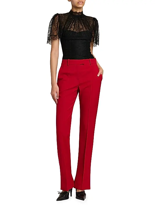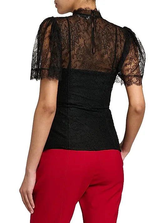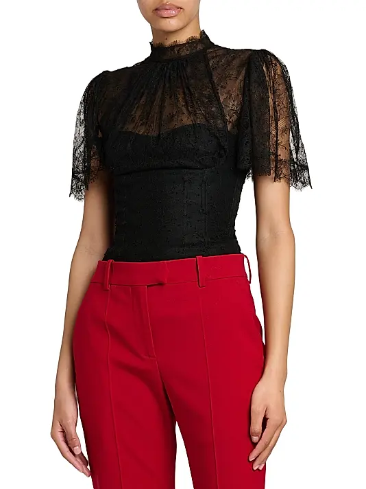 Exude Gothic romance and sophisticated drama with this intricate black lace top. This piece flawlessly combines delicate detailing with a powerful silhouette. The upper portion features a high mock-neck and a sheer floral lace yoke, creating an ethereal, dramatic contrast against the lined bodice. The short sleeves are finished with a delicate scalloped trim and a slight flared or flutter design, adding movement. The centrepiece is the structured, corset-inspired bodice made from a textured, densely-patterned lace, which is designed to beautifully cinch and define the waist for an hourglass silhouette. A separate lining provides modesty across the bust line. Perfect for pairing with high-waisted trousers or a pencil skirt for a refined, evening look.