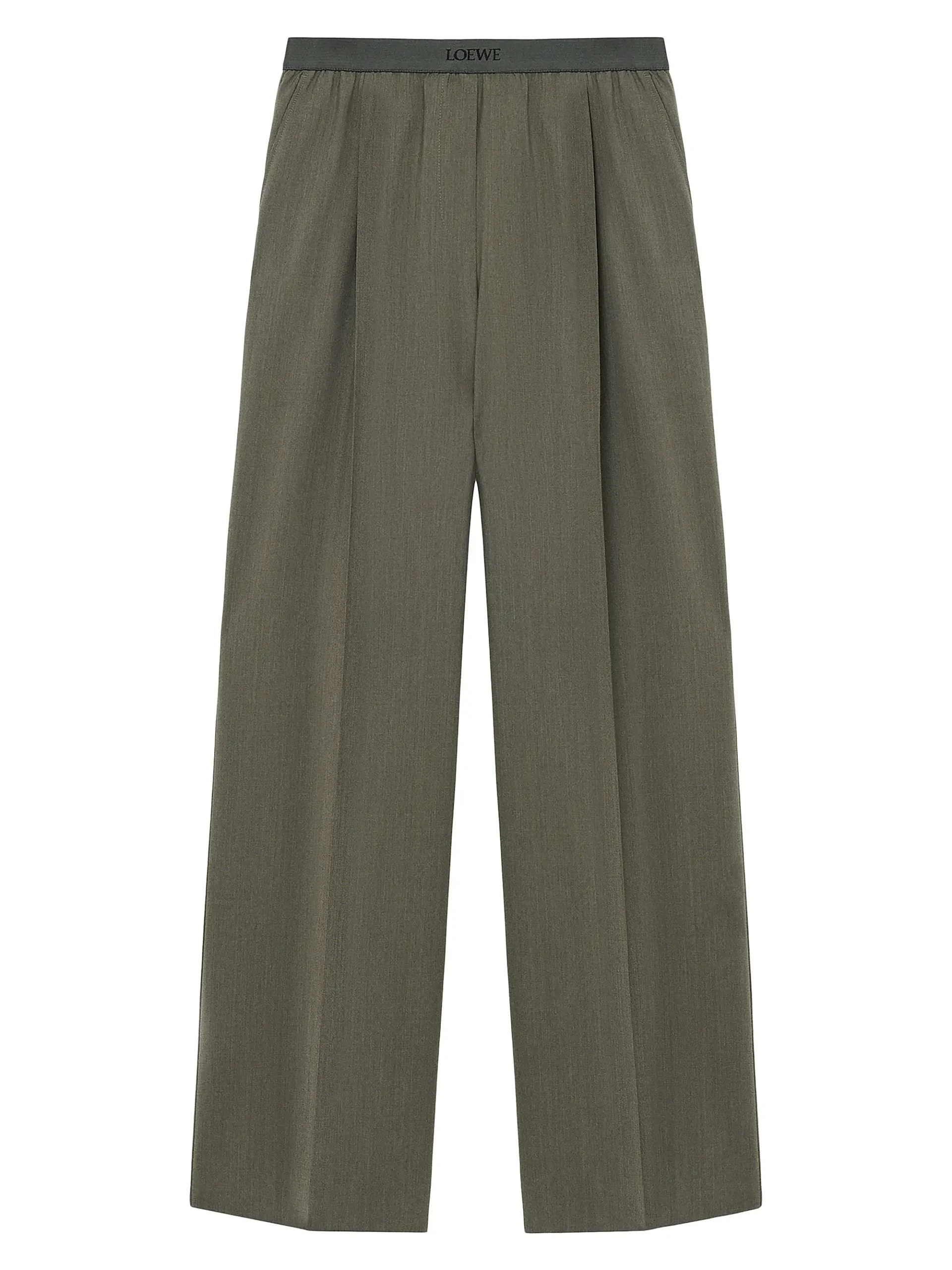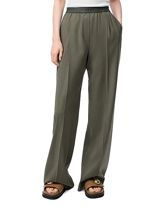 These LOEWE trousers are crafted in Italy from a premium wool blend and designed with a signature logo elasticized waistband for elevated comfort. Featuring a structured creased-front silhouette, the pair includes side slip pockets and a back welt pocket. The refined tailoring and subtle branding embody LOEWE’s luxurious craftsmanship and modern aesthetics. Dry clean only.