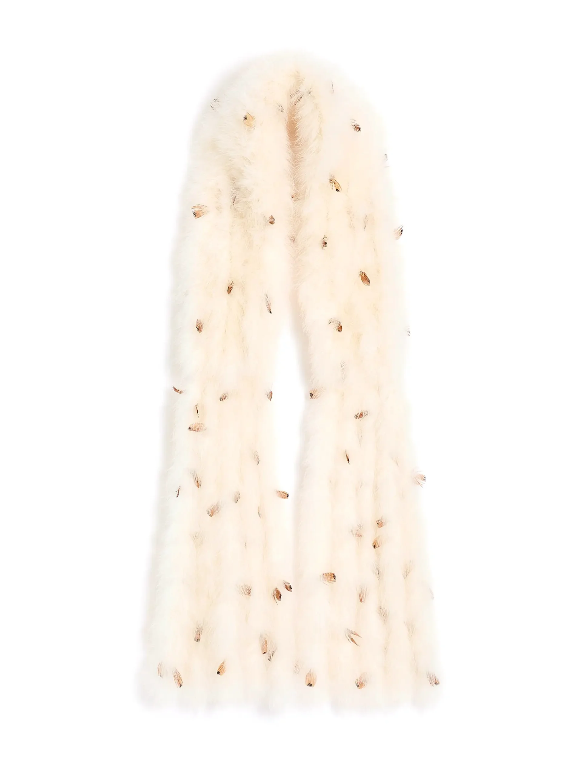 This elegant and voluminous accessory is an off-white or ivory scarf, featuring a dense, plush fur base. It is uniquely embellished with natural-toned feathers or small fur tufts randomly interspersed, adding a beautiful, multi-dimensional texture. This sophisticated stole is an ideal statement piece for formal winter events or high-fashion styling.