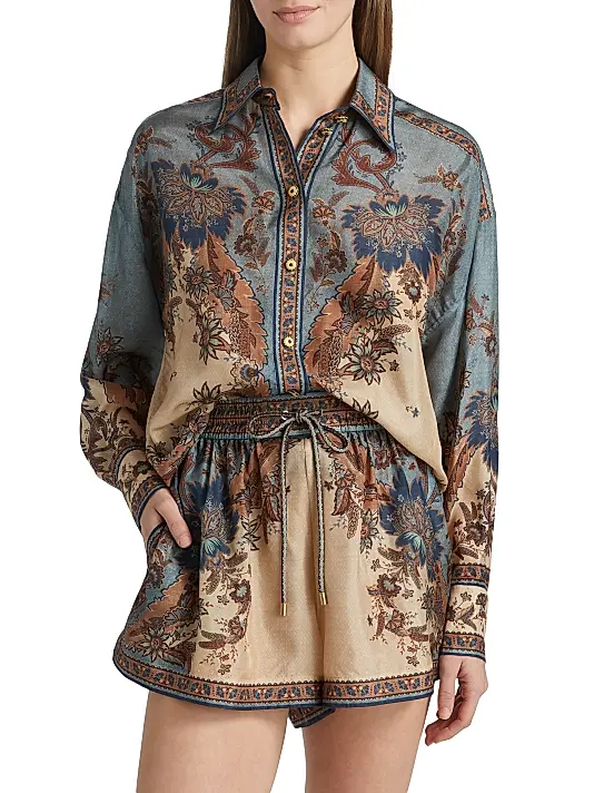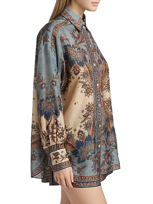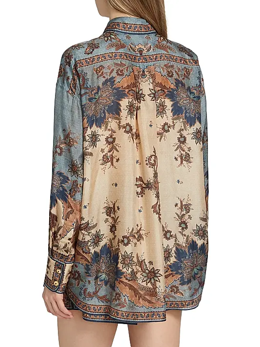 This elegant long-sleeve button-up shirt is crafted from a luxurious, flowing fabric, likely silk or a silk blend, giving it a soft sheen and drape. It features an intricate, symmetrical paisley and floral print in a rich, sophisticated color palette. The print is a beautiful gradient blend of dusty blue/teal, warm beige/tan, and deep rustic brown tones, with subtle details in dark blue and black, creating a stunning visual effect that radiates from the centre.