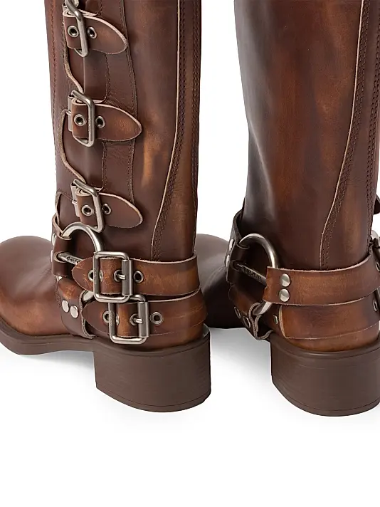 These Miu Miu leather boots are crafted from 100% calf leather and feature bold straps, buckles, and a logo-engraved harness ring for a distinctive, edgy finish. Designed with a 32 cm boot leg, they include a leather lining, hot-stamped logo, leather insole, and a durable rubber sole. The 50 mm (1.9″) heel offers comfort with style. Imported.