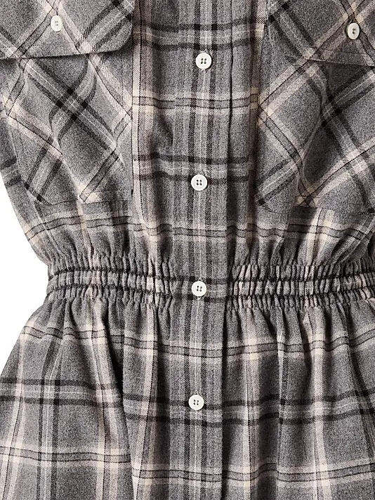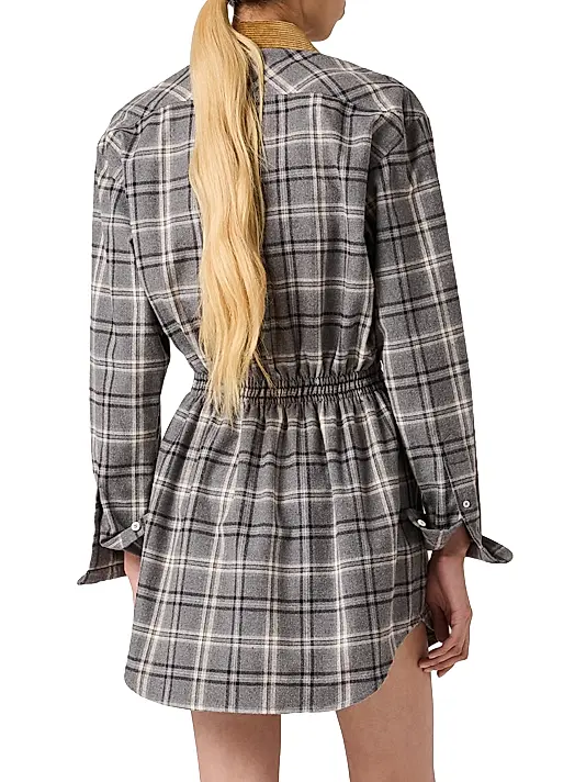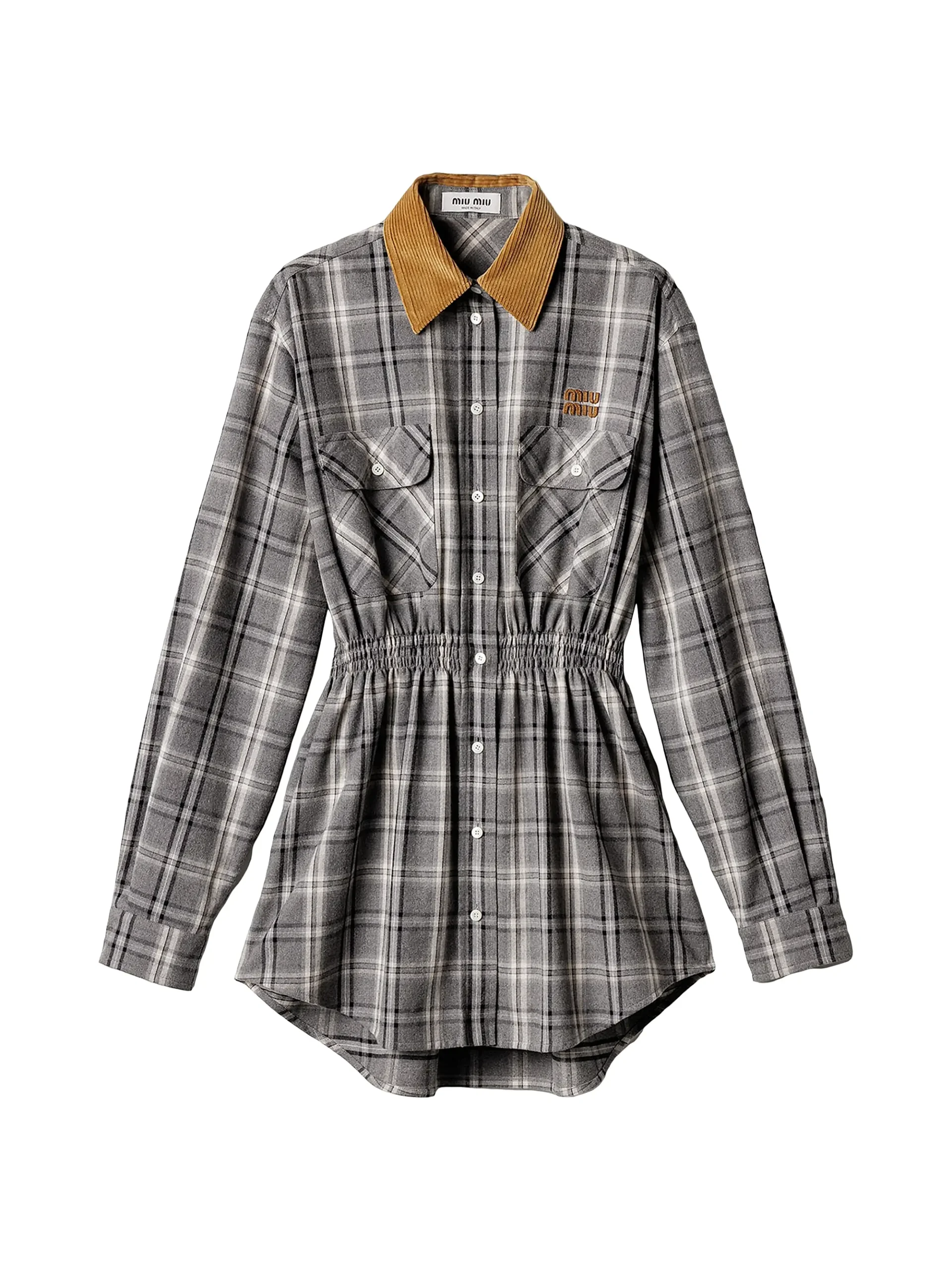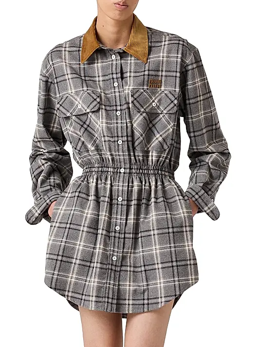 This Miu Miu long-sleeve flannel mini-dress reinterprets classic menswear with a feminine silhouette. It is crafted from soft, grey-tone plaid flannel and features a statement-making, contrasting corduroy shirt collar in a tan color. The oversized shirt style is cinched just below the bust by a defined elasticated or ruched waist , creating a flattering, gathered bodice and a shirttail hemline. The design is completed with button-down front closure, dual flap pockets on the chest, and the signature Miu Miu logo embroidered on the front.