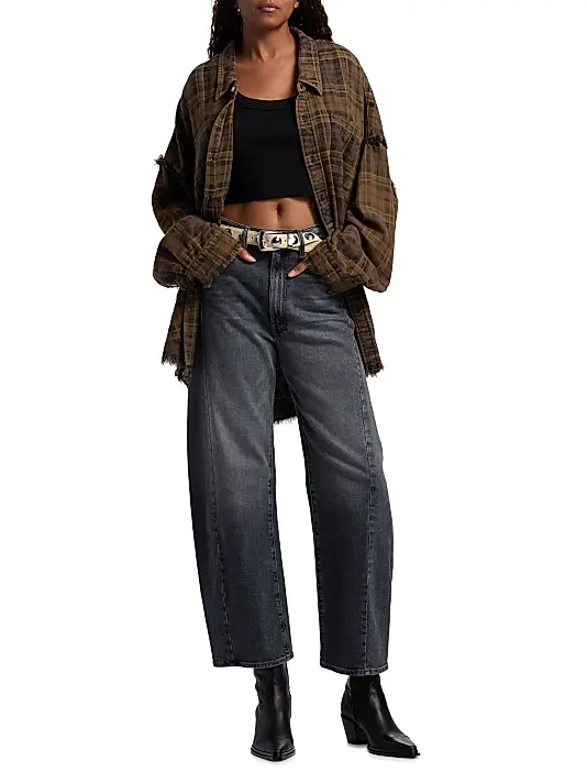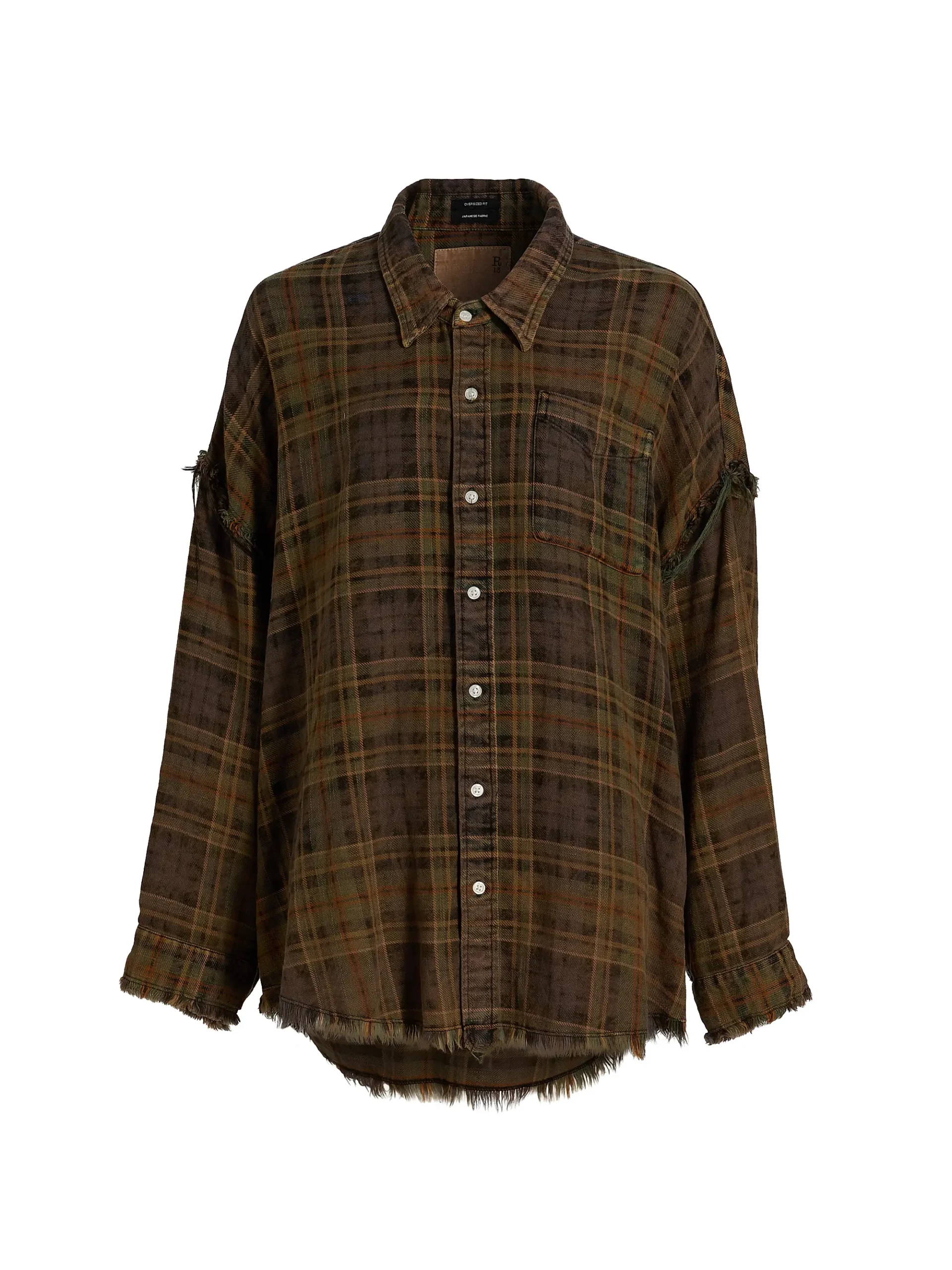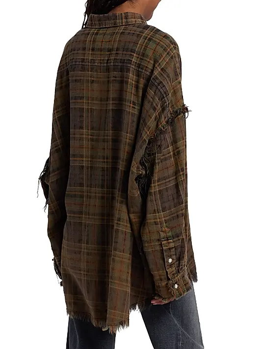 The shirt’s design embraces a heavily distressed and grunge-inspired finish. Key features include a standard collar, a single chest pocket, and a front placket with small buttons. The fabric is deliberately frayed at the hemline and also at the shoulder seams/cuffs, adding to its worn-in charm. Its loose, boxy fit makes it perfect for comfortable layering or wearing as a light jacket.