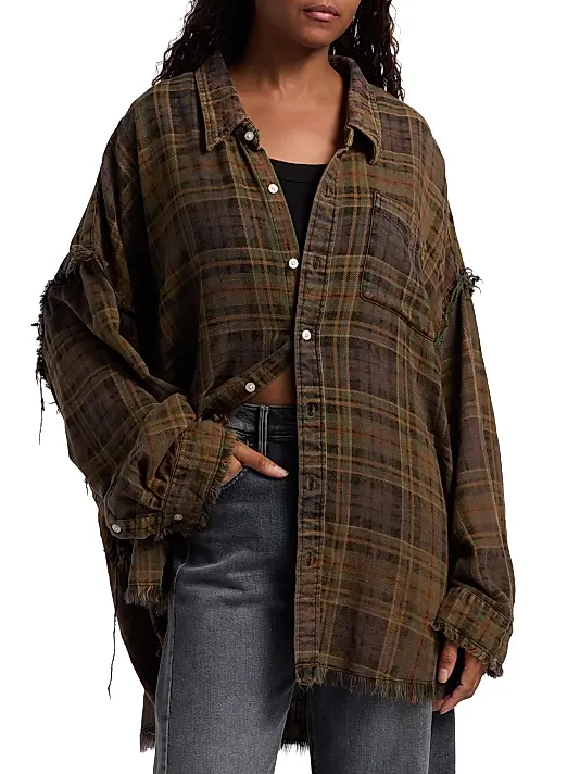 This oversized long-sleeve shirt captures a rugged, relaxed aesthetic. Crafted from a soft, heavy flannel fabric, it features a classic tartan plaid pattern in a muted, earthy palette of deep brown, olive green, and dark red.