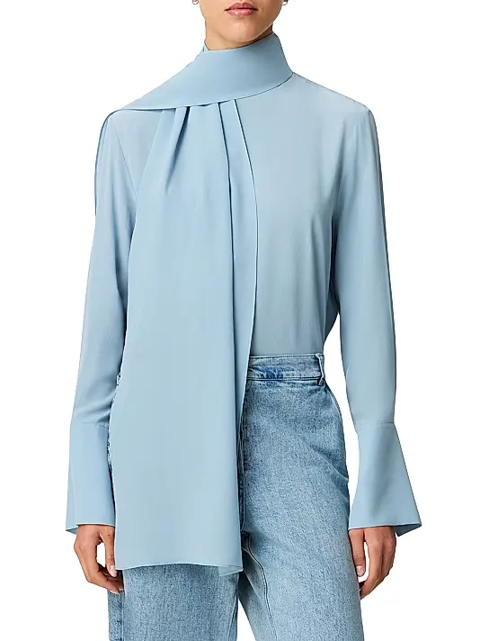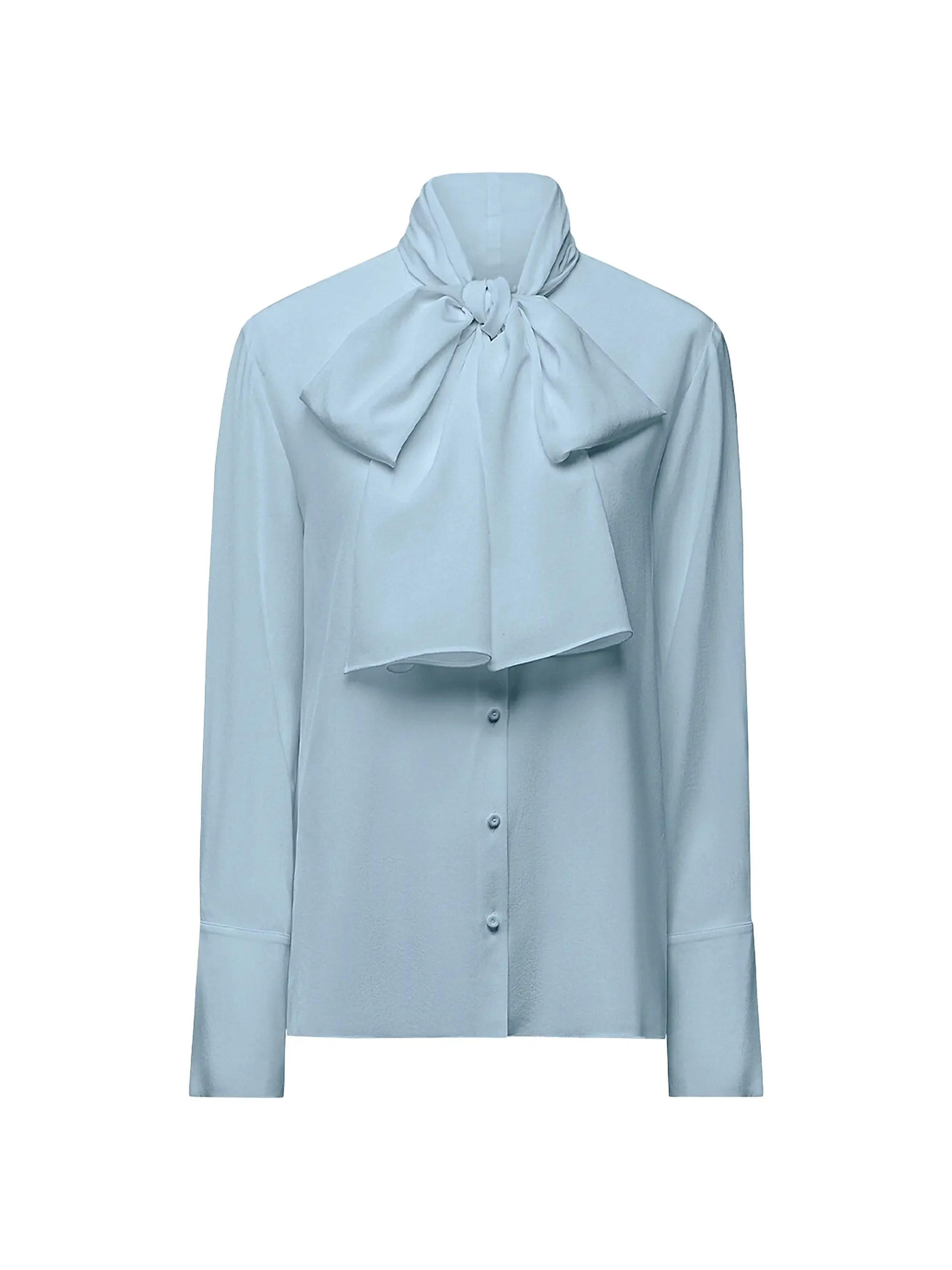 This sophisticated long-sleeve blouse elevates a classic silhouette with luxurious detailing. Crafted in a soft, fluid fabric , the shirt features a beautiful pale blue/sky blue color.