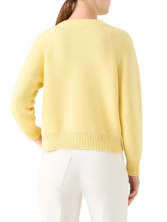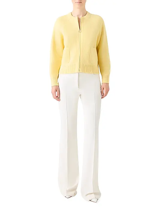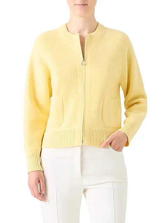 Brighten any ensemble with this cheerful, lightweight knit jacket, rendered in a soft, pale yellow hue. Crafted from a high-quality, fuzzy knit , the jacket features a relaxed bomber-style silhouette without a collar, defined by its round neckline and full-zip front closure with a bold, silver-tone zipper pull. The design includes raglan sleeves for a comfortable fit, two subtle patch pockets on the front, and a contrasting rib-knit trim at the cuffs and hem for structure. This piece is the perfect transitional layer to add color and texture to both casual and sophisticated outfits.