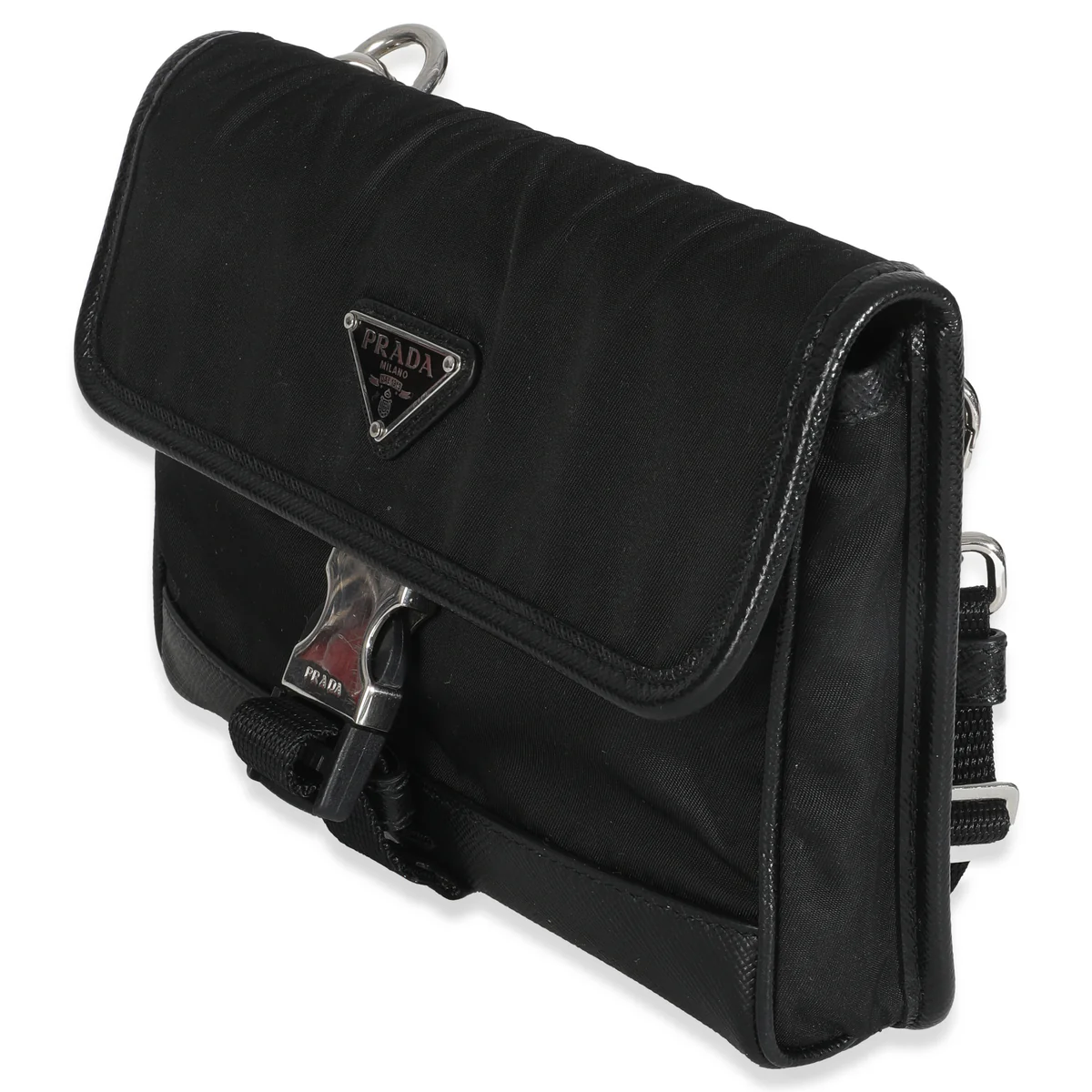 The flap features a prominent enamel Prada triangular logo plaque and is secured by a distinctive silver-tone metal buckle over a web strap. The bottom trim and the edge of the flap are accented with structured Saffiano leather, adding a refined textural contrast and enhancing durability.