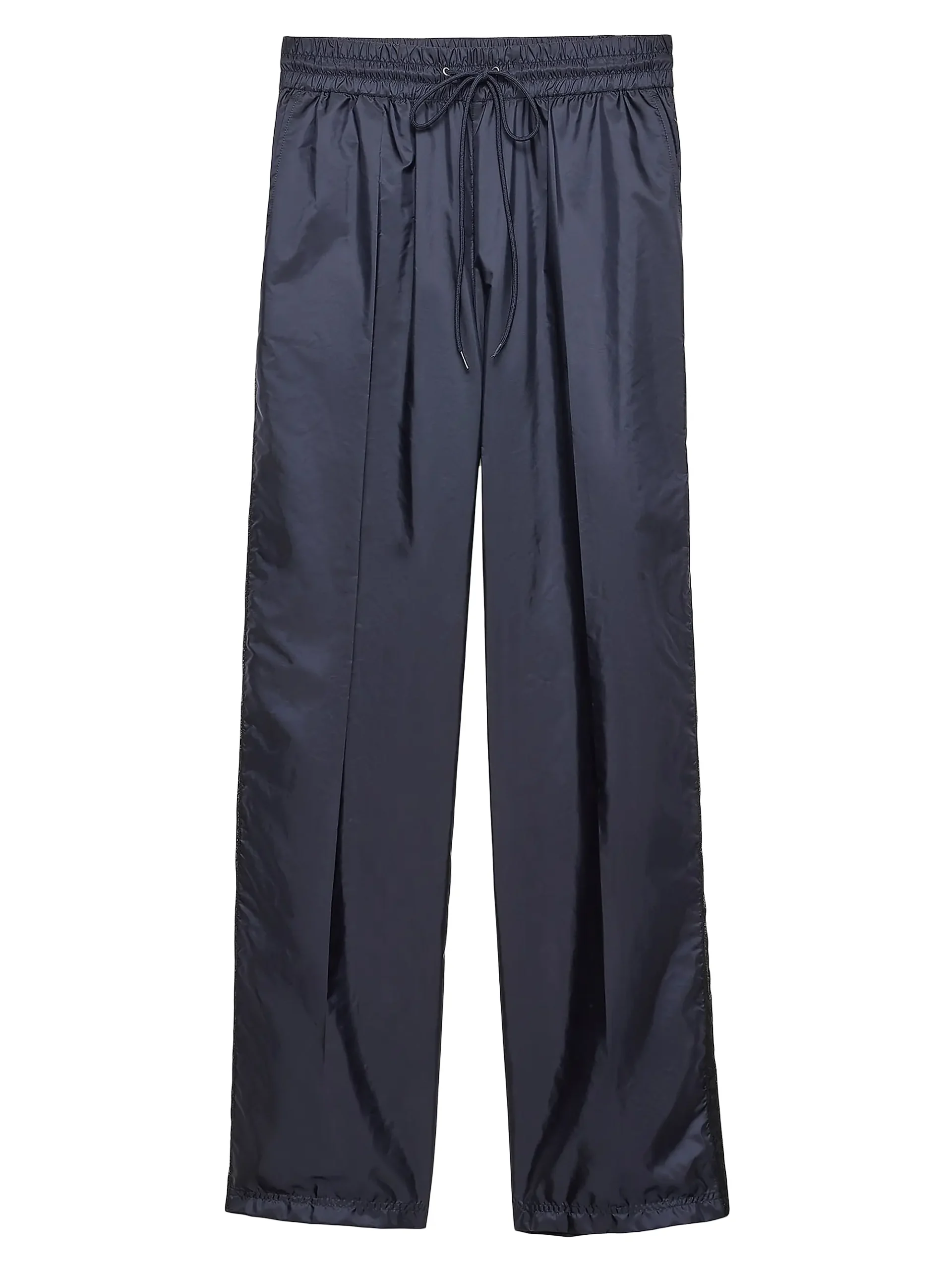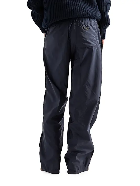 Crafted from Prada’s signature Lightweight Re-Nylon, these pants combine relaxed luxury with sustainable innovation. Designed with a wide-leg fit, the silhouette drapes effortlessly for an elevated yet comfortable look. The elasticized waistband with an adjustable drawstring ensures a flexible and secure fit, while angled slash pockets and a back patch pocket add functional everyday utility. Subtle yet iconic detailing includes the enameled metal triangle logo and delicate intarsia lace trim running down the sides, giving the piece a refined, feminine touch. The garment is unlined and pressed for a sleek finish, making it ideal for modern casual-luxury styling.