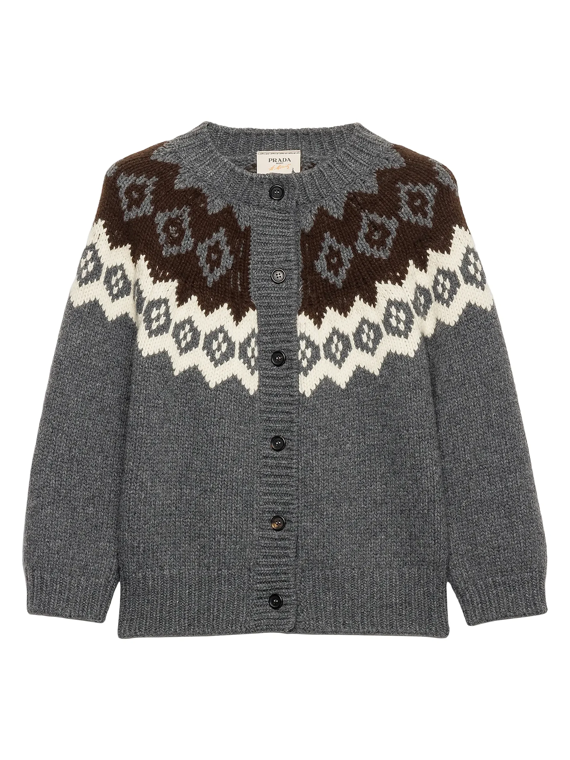& Free ShippingChic Prada cardigan in a grey wool blend featuring a traditional Fair Isle geometric pattern yoke in brown and cream, with a full-button front closure.