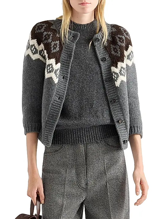 This luxurious Prada cardigan offers a contemporary take on a timeless knitwear classic. Crafted from a premium blend, likely including Alpaca and Wool, the piece features a rich, multi-toned Fair Isle yoke pattern across the chest and shoulders in shades of brown, cream, and grey. The main body of the cardigan is a solid medium-grey knit. It has a round neck, long sleeves, and a full-button placket closure with dark, complementing buttons. The relaxed fit and high-quality fabrication make it an ideal, comfortable, and chic layering piece for the cooler months.