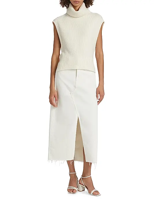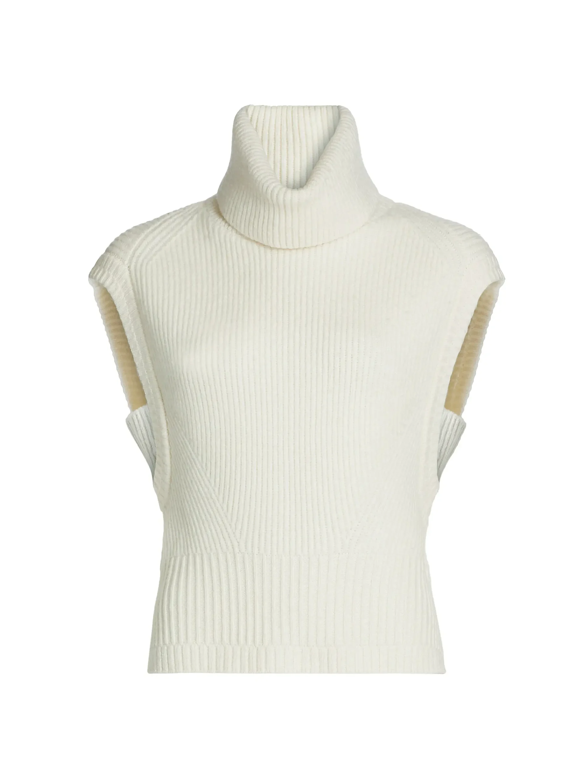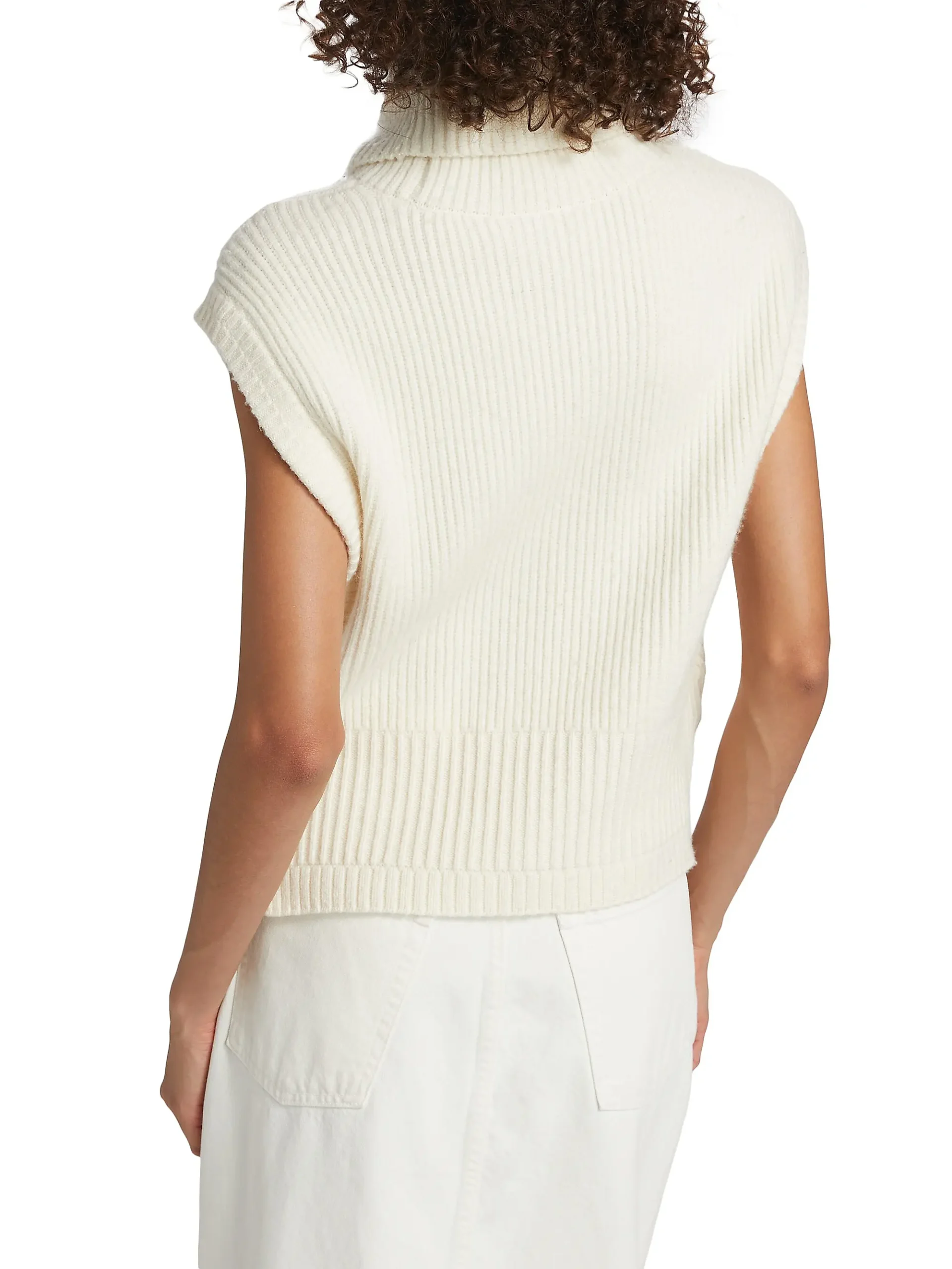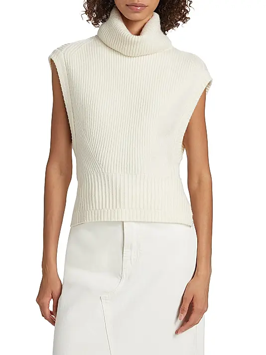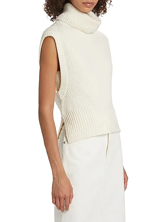 The design is defined by its oversized, folded turtleneck/roll-neck collar for warmth and structure. A notable feature is the tailored shaping on the bodice, created by V-shaped ribbing that cinches slightly at the waist. The sleeveless design and clean, finished armholes make it ideal for layering over thin long-sleeve shirts or wearing solo.