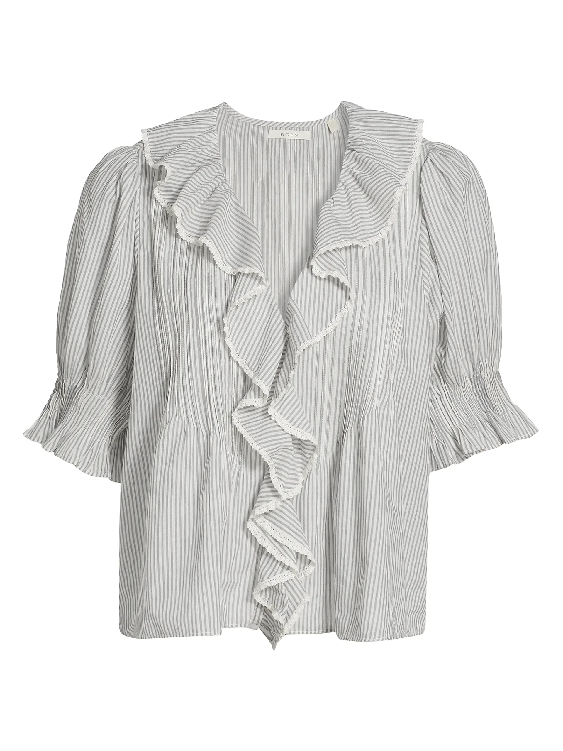 This feminine blouse offers a charming combination of structured pattern and soft volume. It is made from a lightweight fabric, possibly cotton or linen blend, featuring a subtle vertical pinstripe or fine woven stripe in white and pale grey/blue.