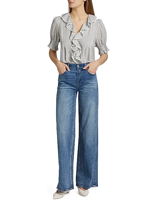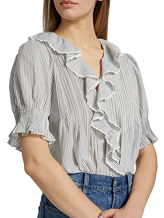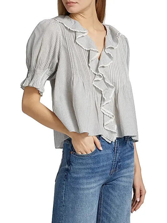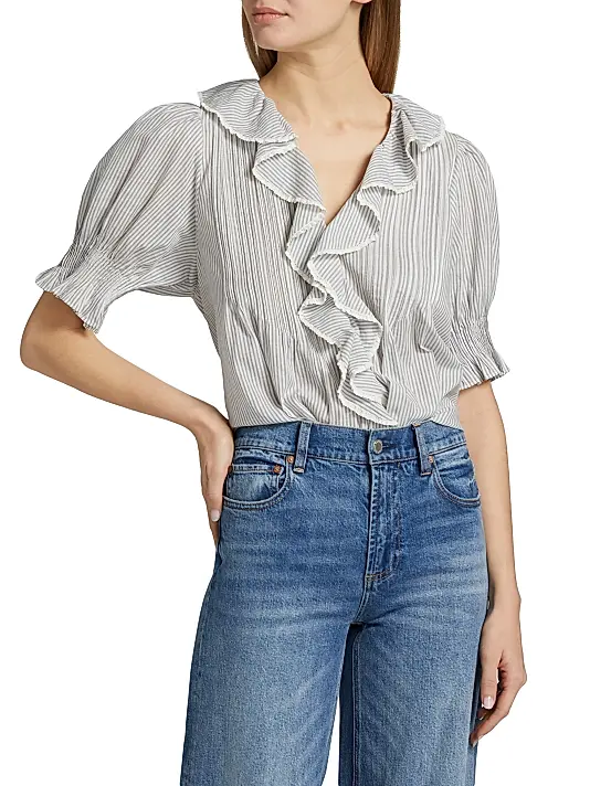 The defining feature is the cascading ruffle detail that frames the V-neckline and extends down the center front. The ruffles are edged with a delicate scalloped or lace trim, adding a vintage touch. The sleeves are short, slightly puffed, and end in a ruffled or gathered elasticized cuff. The silhouette is tailored at the bust before flaring gently at the waist, creating a flattering peplum or empire-waist effect.
