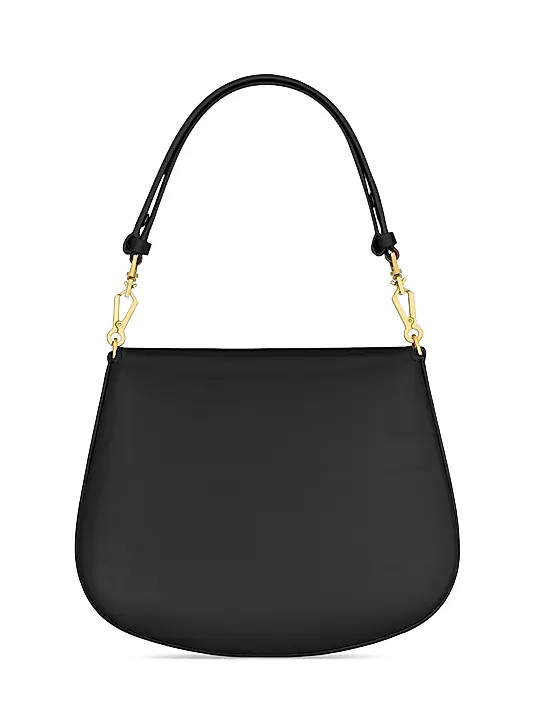 Crafted from luxurious smooth black leather with a subtle sheen, the bag features a contemporary saddle shape and a sleek, rounded flap closure. The iconic gold-tone metal YSL Cassandre Monogram serves as the central focal point, offering an immediate touch of recognizable luxury. The adjustable leather shoulder strap attaches via chic gold-tone hooks, allowing it to be comfortably carried close to the body.