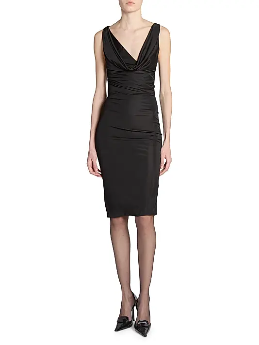 A classic black Saint Laurent sleeveless dress featuring an elegant cowl neckline and figure-flattering ruching for a body-con silhouette. A timeless piece for sophisticated evening events.