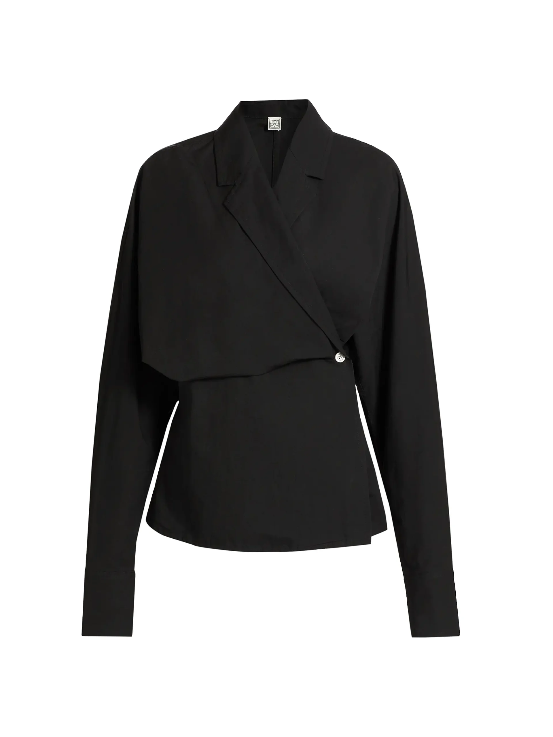 Crafted from a crisp fabric (likely cotton or a stretch blend), the top features a dramatic asymmetric wrap-front closure, fastened by a single, prominent contrast button at the waist. It boasts a sophisticated lapel or blazer-style collar and clean, long sleeves with buttoned cuffs. The bodice is tailored to define the waist, while the unique draped and layered construction across the chest creates a beautiful, contemporary silhouette.