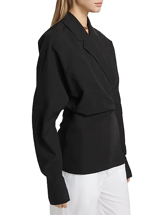 Elevate your workwear and evening attire with this striking Sculptural Wrap Blouse. This piece redefines the classic black top with its architectural and modern design.