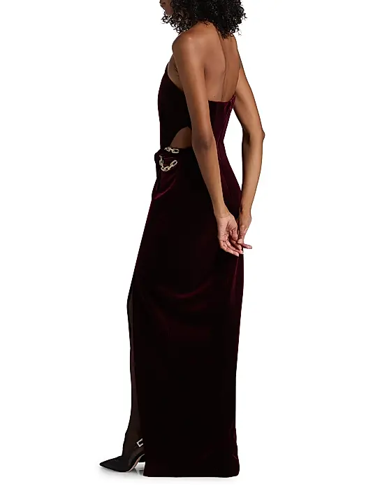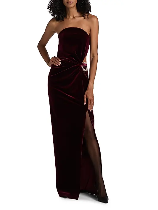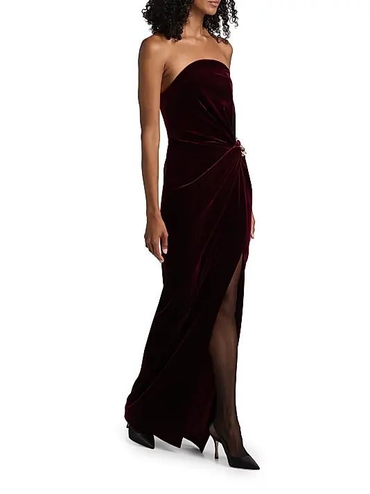 Command attention at your next black-tie event or gala in The ‘Burgundy ‘ Velvet Strapless Ruched Gown. This exquisite floor-length dress is crafted from sumptuous, deep or Burgundy velvet that catches the light beautifully, offering a luxurious texture and rich color perfect for the evening and holiday season.